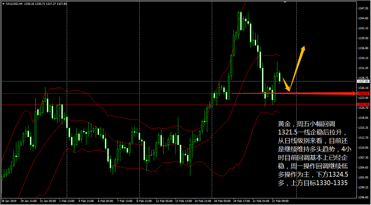 黄金周五小幅回调1321.5一线企稳后拉升,今天(2月25日)从日线级别来看,CCI指标在跌下买入线后转而平走,KDJ指标下行动能缓慢,MACD双线远高于荣枯线,表明黄金目前还是继续维持多头趋势。 4小时级别走势与日线相差不大,KDJ的上升走势与MACD的企稳不构成背驰,布林带仅偏收口,说明黄金目前的回调已经基本企稳。 王德勤认为,今天黄金操作上继续以回调低多为主,下方1324.5多,上方目标1330-1335。 来看镑美,镑美上周五盘中小幅回调企稳后大幅拉升,日内直接走出V字反转,收出1.3053,日内反涨0.08%。 先从4小时图上看,再次回到区间震荡,盘中探底回升后多头力度较强,行情连