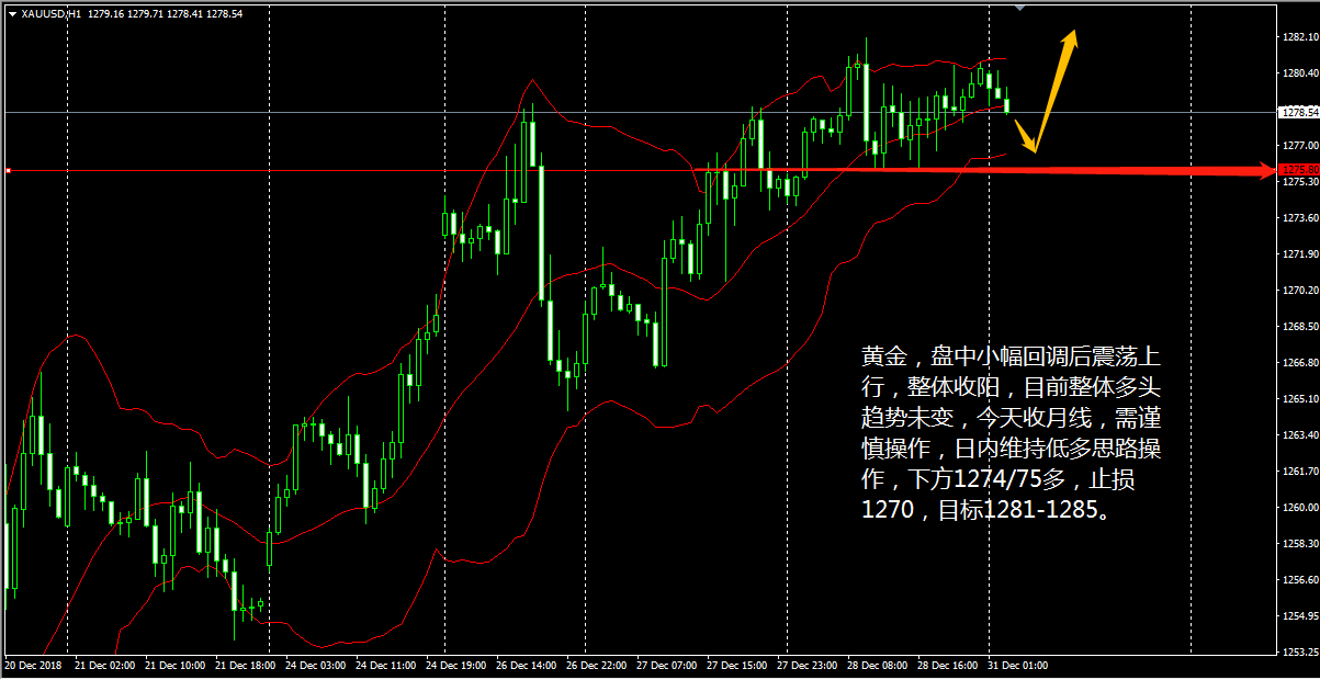 各位好,今天 (12 月 31 日 ) 这个交易日过后,明天就是元旦节了,希望大家跟我一样连续取得丰收,今天也是面临 2018 年 12 月的月线和年线的收官日,就目前的趋势看,月线收阳、年线收阴几乎是板上钉钉的事了,但就小级别来说,黄金多头趋势还是比较牢靠的,日内只需关注金价能够回调多少这一问题上面。 在黄金 1 小时线上看,黄金小级别走横盘震荡整理, CCI 刚刚离开卖空线, MACD 于零轴上方的死叉延续,但并未触及零轴,空头能量柱小幅收量,表明黄金目前的走势还是多头。 王德勤认为,黄金前一交易日走震荡上行,价格在盘中小幅回调后依旧收阳,整体上的多头趋势未变,今天收月线,操作上宜谨慎,