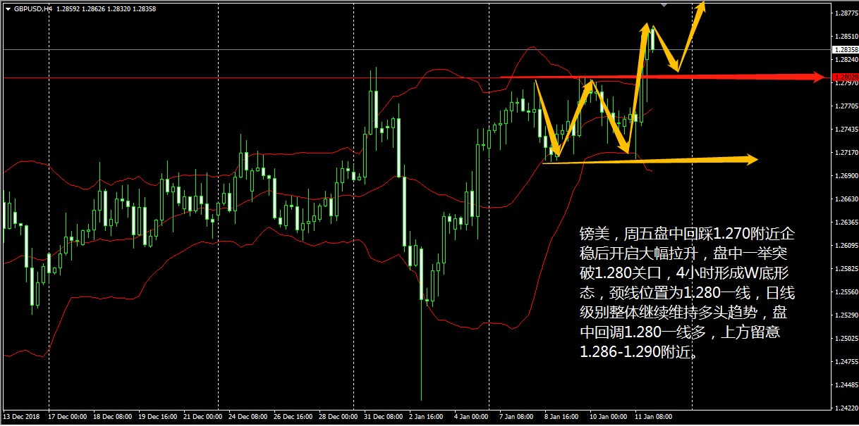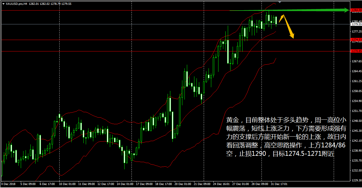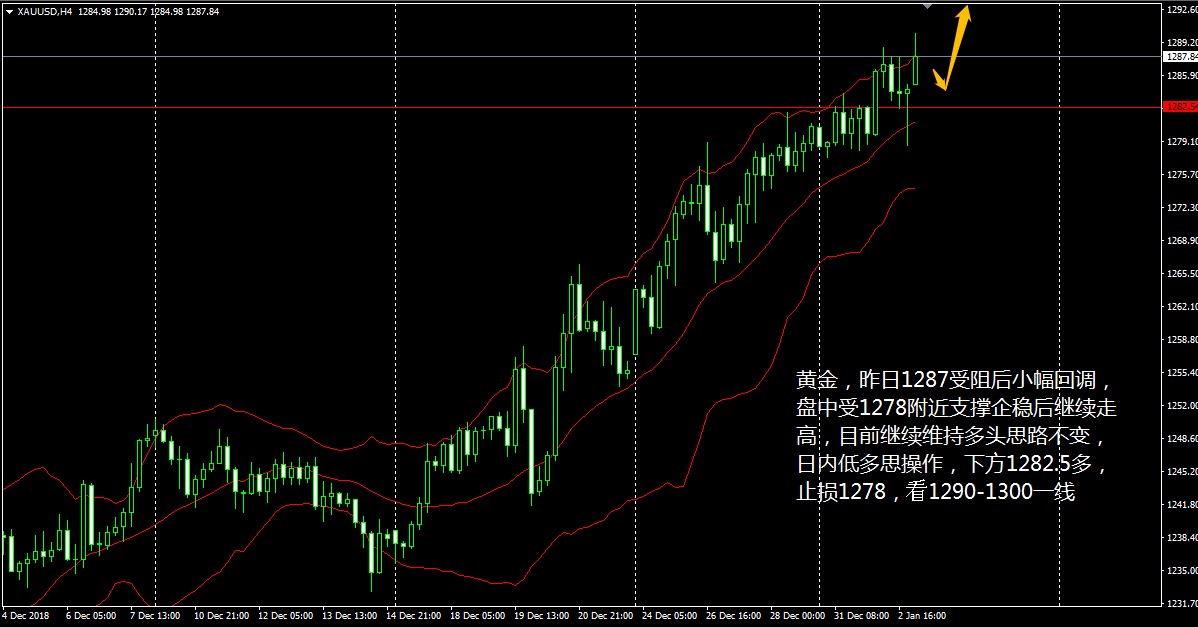 大家好,今天作为 2019 年的第一个交易日,对本周行情会起到一个 “ 穿针引线 ” 的作用,也能降低我们操作短线的难度,就目前各品种的趋势来看,因美元指数的疲软,黄金等非美品种皆出现了比较明确的走势,而原油似乎也能看到一丝反弹的迹象。好了下面就看我今天给大家带来的分析吧。 黄金 4 小时图中看,布林带三轨上行中略带开口, MACD 双线转而上行,红色能量柱开始放量,标志着金价短线涨势还在继续。 老王认为,黄金目前整体处于多头趋势,本周一高位小幅震荡,短线上涨乏力转低,下方需要形成强有力的支撑后方能开始新一轮的上涨,故日内看回落调整,高空思路操作,上方 1284/86 空,止损 1290 ,
