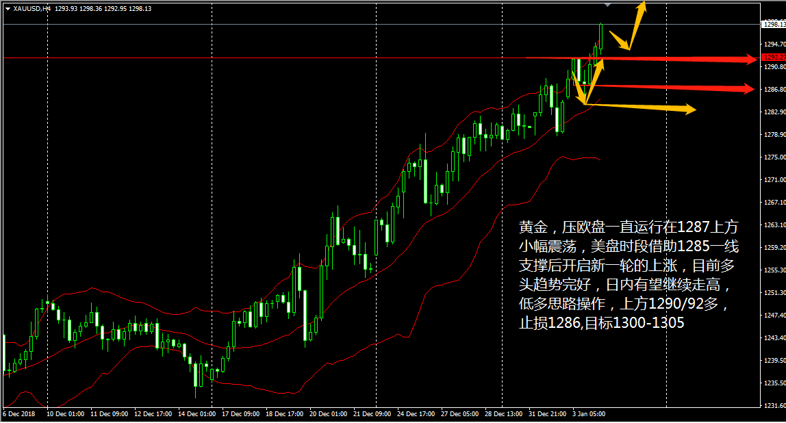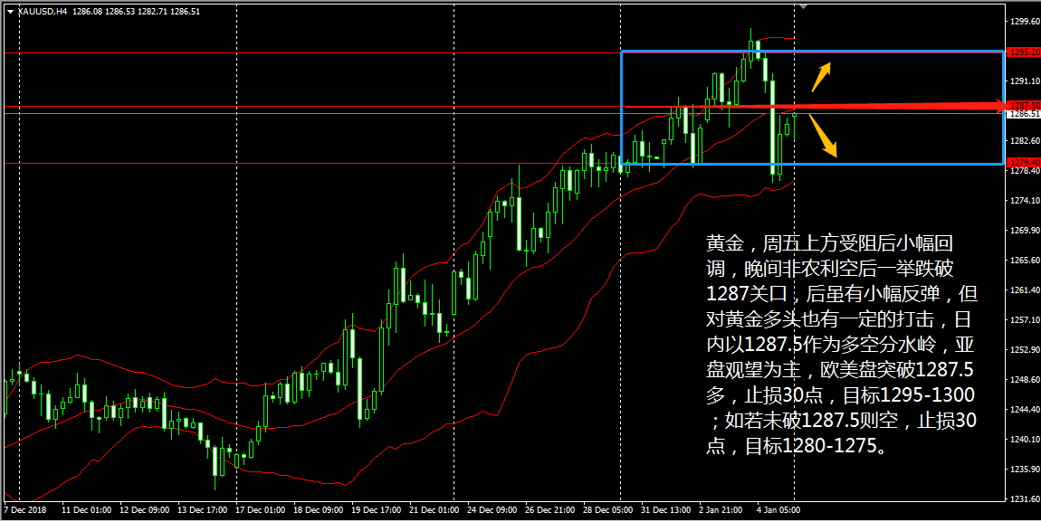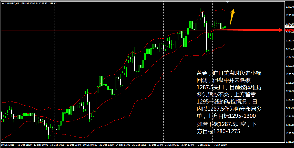 大家好,今天( 1 月 4 日)晚上美盘时段将有包括美国大非农、 12 月时薪率、 12 月失业率、服务业 PMI 、 EIA 等一系列具有较大影响力的数据公布,可想而知晚边的行情波幅会非常大,晚间我会择机布局,大家等我短线通知就好。 黄金 4 小时上看,金价的回调已经开始, KDJ 指标的死叉下行与 MACD 红色动能柱的加速收量契合, CCI 跌至买入线以下,表明黄金目前的回调还未结束,但布林带三轨的升势还未发生改变,所以我们默认黄金仍是多头状态。 王德勤认为, 黄金昨日亚欧盘一直震荡运行在 1287 上方,美盘时段借助 1285 一线支撑后开启新一轮的上涨,目前多头趋势完好,日内有望继