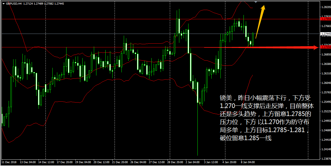 北京时间周四(1月10日)凌晨,美联储公布了去年12月议息会议的会议纪要,在市场得知美联储委员们不在强硬力挺“渐进式加息”后,投资情绪大为转变,美元指数迅速走低,至亚市午盘过后,美指最低触及95.0238,创下自去年10月中旬以来的最低水平。 而美指的大幅走低为黄金、镑美带来良性刺激,日内金价、镑美汇价纷纷上扬,并且在指标上都呈现出良好的升温警示,降低了我们日内操作的难度。 黄金4小时走势图上看,布林带上轨呈下拐趋势,暗指黄金当前已经到达一个阶段性的顶部,但MACD的多头信号明确,咱们就理解为冲高后的惯性回落,目前MA各级别均线升势良好,下方支撑位也在不断上移,今日就抓黄金价格的回调做多机会