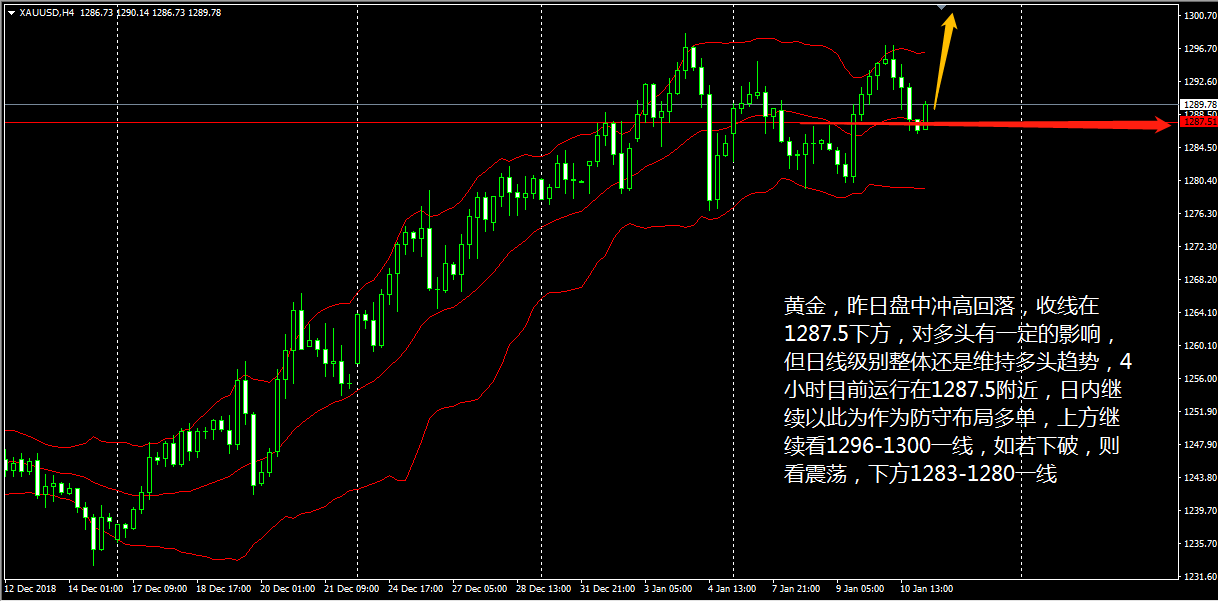 昨日由于美联储主席鲍威尔在讲话中肯定了美国经济的良好状态后,美元指数的反弹也是逼近95.6关口,对黄金等非美产品形成一轮打压,但至今日(1月11日)亚盘,黄金等非美品种再度上扬,可以看出亚洲买家们并没有买“鲍威尔的帐”,毕竟美联储加息预期的降低,对整个市场的投资情绪影响太大。 现货黄金今天也是一如既往地高开高走,目前金价交投于4小时级别布林带上轨下方的1293美元一线,MACD的金叉走势虽较弱,但KD线已有聚拢上行之意,看来金价目前的涨势是能够继续维持的。 黄金昨日盘中冲高回落,收线在1287.5下方,对多头有一定的影响,但日线级别整体还是维持多头趋势,4小时目前运行在1287.5附近,日内