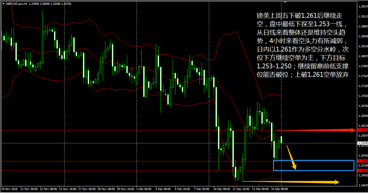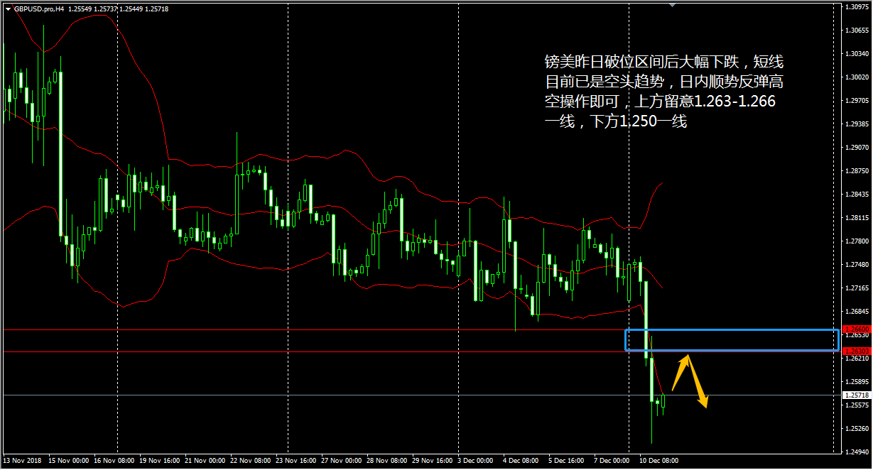 昨晚最大的行情就来自英国首相特蕾莎 · 梅,在她宣布推迟英国议会对当前脱欧协议的最终投票日后,英镑汇价直线暴跌,美元指数则获得巨大上涨动能,并于美市尾盘中站上 97.2426 ,创下本月来的新高。受此突发性因素影响,镑美价格自然暴跌,黄金价格也因此一度触及 1250 美元关口。 在镑美 4 小时图上看,镑美昨日破位图中的蓝色区间后继续大跌,短线已经摆明是空头趋势,预计今天镑美价格将反弹至前期的支撑区间后重启跌势,暂时性的惯性反弹不必纠结,我们保持高空的思路就好。 黄金昨日小幅回调,最低下探至 1241 附近,但从 4 小时图来看,布林带三轨的上升走势意味着黄金整体的多头趋势尚