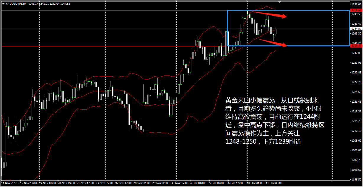 各位好,周二美盘期间的一系列消息面行情的公布,对原本走出单边的黄金、原油等行情进行了新一轮修复,今日 (12 月 12 日 ) 亚市,黄金、原油都延续昨日美盘的反弹行情所展开,不过镑美的行情稍显复杂,由于英国首相特蕾莎 · 梅推迟了本在昨日就开始的脱欧抉择,令英镑的去向充满了不确定性,当然在技术面的指示仍未空的情况下,我也不可能去做逆势。所以我们今天操作上的一个大体思路就能确定,及金、油暂看延续反弹,镑美则继续看空。 先从现货黄金 4 小时图来看,黄金目前维持 1244 附近高位震荡,盘中高点伴随布林带的下移而下移,眼下 KD 线大幅走低,预示了黄金短线将继续下行。再从日线来看,金价