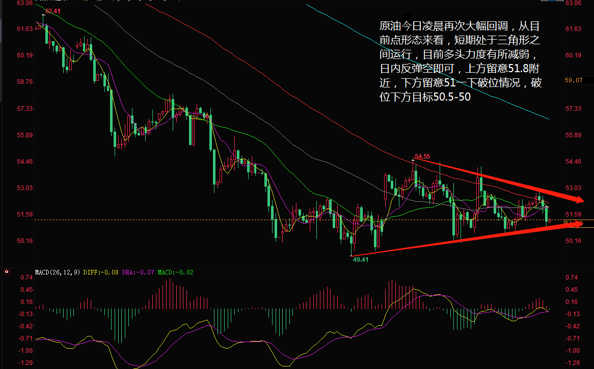 因昨晚 23:30 公布的 EIA 原油库存数据表现不及预期,油价在今天 (12 月 13 日 ) 凌晨再次大幅回调,从 4 小时图目前的形态来看,原油短期处于三角形之间运行,多头力度有所减弱,各小级别均线交织下行, MACD 的死叉形态即将成型,且双线均位于零轴下方,表明行情还有进一步的跌势。 黄金方面,昨日金价在高位小幅震荡, 4 小时线中的高点不断下移,短线有筑顶迹象,盘中留意 1242 一线的破位情况, RSI 出现上拐迹象,但布林带持续收口意味着行情的反弹力度有限,我是认为黄金整体上的震荡走空还将维持。 王德勤认为,原油日内反弹做空即可,上方留意 51.8 附近,下