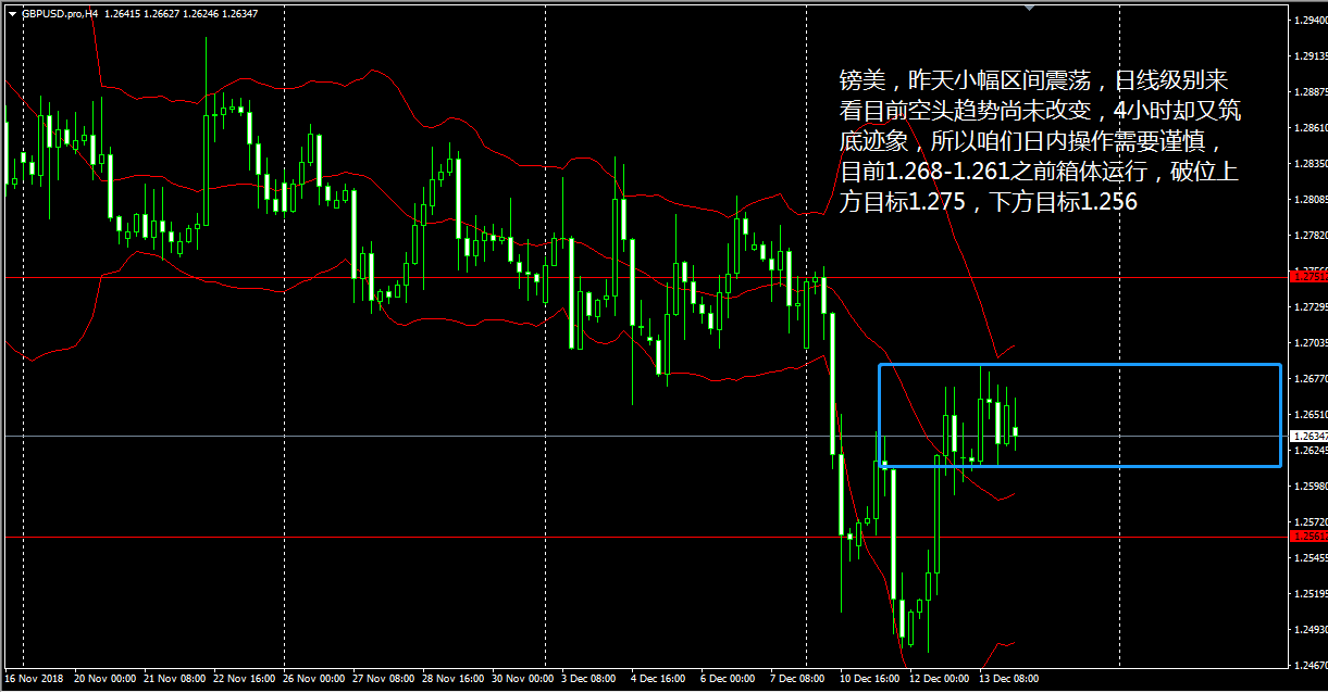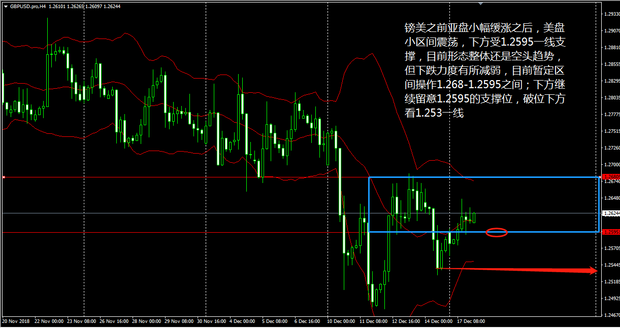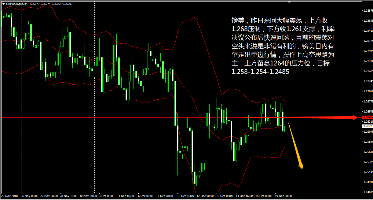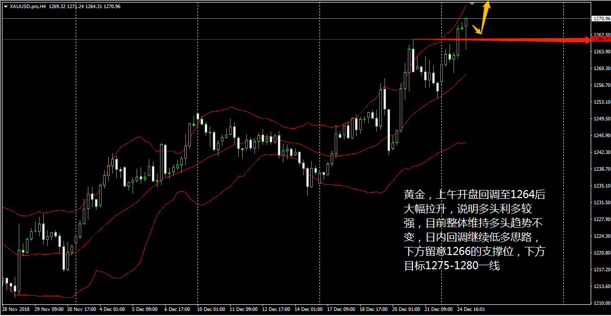 各位好,我们圣诞前说的周三再战,如今就要兑现了,晚上美盘我们应该就会恢复正常操作,大家要跟上老王的节奏了。 今天( 12 月 26 日)亚市,黄金原油双双高开高走,午盘过后俩品种走势逐渐 “ 背离 ” ,目前黄金的回落需求和原油的反弹需求都体现了一定的预见性,此时操作明显是不合时宜的。另外镑系也出现了涨幅回吐的情况,操作上宜等价位降至理想点位后才行进场。 黄金 4 小时图上看,布林带三轨升势不弱,且金价持续运行于上轨一线,体现了黄金多头的强势,眼下 KD 线自超买区小幅下拐,与 RSI 三线的分散走低相得益彰,预示了金价短线将出现回落。 老王认为,黄金上午开盘回调至 1264 后大幅拉升,说