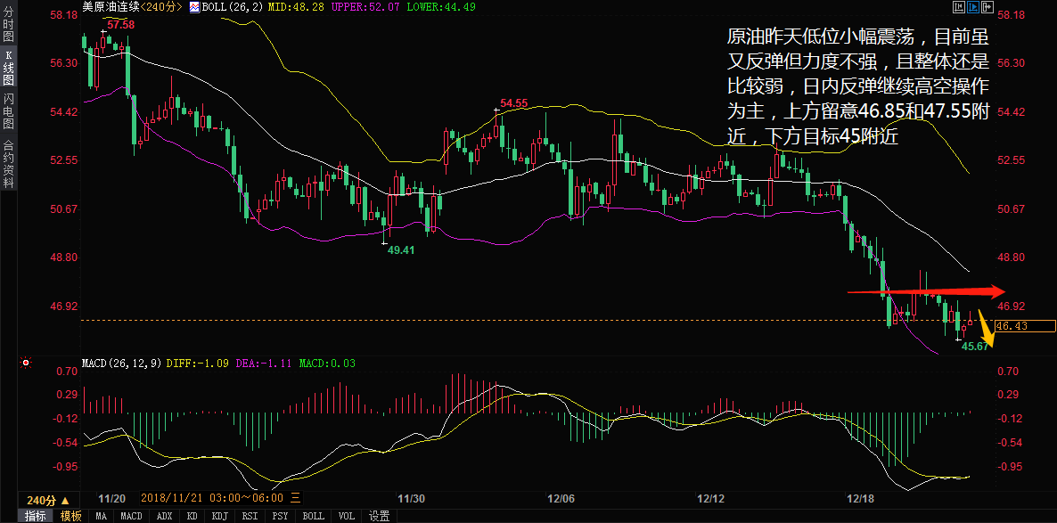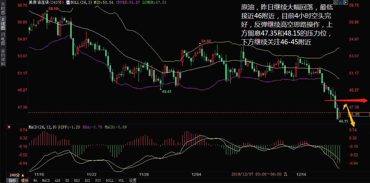 原油这几天的行情非常大,并再度走出单边,所以今天先看原油,本周才过去两天,原油价格的跌幅叫超过了前三周只和。月线中已经看到油价已经刷新了自去年 8 月份来的最低水平。 在原油 4 小时图上看,油价自昨晚超跌出布林带三轨意外后,随即而来的惯性反弹也是后继无力, MACD 死叉进一步向下方延伸,且未至超卖区, KDJ 于超卖区附近走缓,看来原油短线的跌幅将减缓。 王德勤认为,原油昨日继续大幅回落,最低接近 46 附近,目前 4 小时空头完好,日内等反弹后继续高空思路操作,上方留意 47.35 和 48.15 的压力位,下方继续关注 46-45 附近。 再看黄金,黄金这几日震荡走高,其中有突发