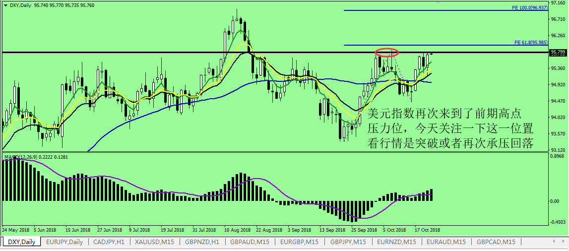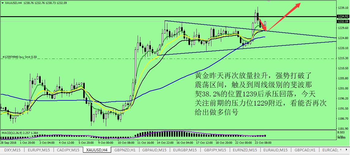 美国债市对美元的支撑作用非常明显,在半月前美债 10 年期收益率达到 3.23% 以上时,美元指数很快重返 96.15 上方,而在上周美债收益率回落之余,美元指数也随之暴跌,最低触及 94.7836 ,刷新了自 9 月底来的新低。昨日美市收盘,美国 10 年期国债收益率录得 3.194% ,其价值已经企稳。 受此影响,美元指数亦随之大涨,隔夜美指最高涨至 96.09 ,创下自 10 月 9 日来的最高水平。而相对应的,现货黄金价格则回落至 1220 关口一线,但受到市场风险情绪催动,黄金价格昨日的跌幅不大,仅为 0.36% ,所以这也对我们今天做单给予了一些继续看多的希望。 美元指数
