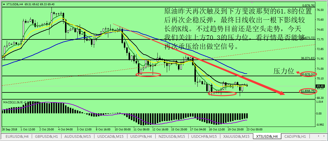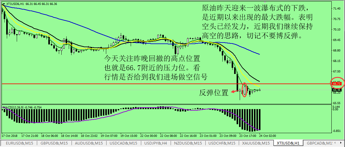 北京时间周三 (10 月 24 日 ) ,原油价格自 66.17 美元处低开,在短线上触 66.67 美元后随即回落,眼下欧市盘初,原油价格由涨转跌,从技术面上看,原油这波震荡下跌行情还将延续。 原油 1 小时走势图上看,当前油价处于 66.4 附近低位震荡, KDJ 指标聚拢死叉向下, 20 均线的走势形成当前油价的反弹压力位,这也是昨晚油价回撤高点的压力位, RSI 指标于 30 附近聚拢上行后转而下拐,表明原油当前的反弹力度即将消散。 记得早在本月初,沙特能源部长法利赫就表示了 11 月份将再度增加原油产量的预期,记得他当时是说 10 月份沙特产油量将在 1070 万桶 / 日的水