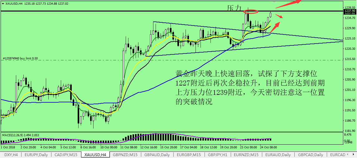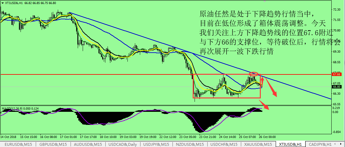 美元指数在昨日美盘时段加速上涨, 96.7358 的高点也创下了自 8 月 15 日以来的新高,受此压力,黄金原油不约而同地走入窄幅震荡,周五 (10 月 26 日 ) 亚市早盘,美原油价格开盘报 66.95 美元 / 桶后震荡于 66.86 美元一线,现货黄金亦在开盘价 1232.16 美元 / 盎司附近徘徊,现报 1232.04 美元 / 盎司,日内跌幅 0.01% 。 王德勤认为,原油近期的跌势行情比较单一,我想要不是昨晚美指大涨,令投资者转移了一些空头情绪到非美品种,不然黄金的高位震荡不可能与原油的单边跌势契合,所以今天我预计黄金原油在亚市早盘震荡同步走低的概率较大,但操作上会有区别