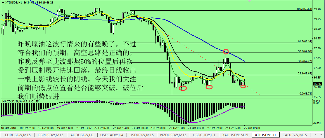 原油昨晚这波行情来的有些晚,不过还是符合我们预期的,也就是说我们高空思路是完全正确的。今日 (10 月 25 日 ) 就我预计,原油行情基本会延续昨日 EIA 数据行情的方向去走,因此做空已经成为市场主流观点,在这种大的空头趋势之下,我建议还是顺势而为地好。 数据行情血洗油市 北京时间周三,美国石油协会 (API) 及美国能源信息署 (EIA) 分别公布了 10 月 19 日当周美国原油库存情况,总体上看,两项数据均显示美国上周原油库存,库欣地区原油库存上升,汽油和精炼油库存下降,从汽油和精炼油库存下降来看,美国加工型油企活跃度非常高,但原油市场交易额从库欣地区的油量上升来看,是处于低迷状态
