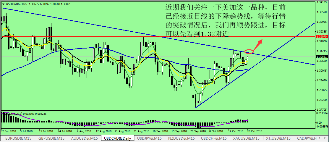 近期我们关注一下美加这个品种,按照惯例,我们还是以美元作为类比对象来分析,本周三加拿大央行宣布将基准利率上调 25 个基点,一度将原本加速反弹的美加行情予以重创,虽然美元指数随后反弹,但依旧收跌 0.21% ,将日内涨幅回吐。昨日,美指于美盘时段的暴力拉升将跌势逆转,今天 (10 月 26 日 ) ,美加自 1.3074 开盘后震荡走高,现已经涨破本周高点的 1.3126 ,目前仍处于拉升阶段。 美联储新任副主席放鹰 北京时间周四 (10 月 26 日 ) ,由特朗普新任命的美联储副主席理查德 · 克拉里达发表首次演讲,出乎意料的是,原本以为特朗普想扶植一个倾向宽松政策的副主席竟然公开于特朗