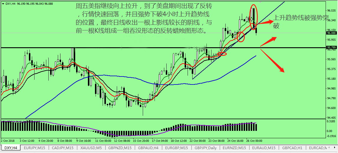 当地时间周三 (10 月 24 日 ) 美国股市再度暴跌,道指跌幅 2.41% ,标普 500 收于 2656.1 ,跌幅 3.09% ,纳指跌幅最大为 4.43% ,周三的跌幅更甚于周二,在美股备受投资者抛售的情况下,美元指数持续拉升,周三美市盘中,美元指数最高上触 96.5491 ,创下自 8 月 17 日以来的最高水平,现货黄金价格则在短线内遭受冲击,最低触及 1225.73 美元 / 盎司。 从美元指数 4 小时图上看,昨日美指在上破 96.54 的前后已经打破了布林带上轨的压力,属于明显的超买信号,眼下美指冲高回落, RSI 指标下行速率放缓, MACD 于零轴上方的死叉还