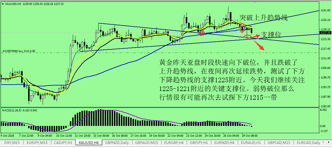 大家早上好,昨日黄金于亚盘时段的快速拉升后迅速向下破位,并且跌破了上升趋势线,昨夜美盘时段再次延续跌势,并测试下方下降趋势线的 1225 支撑,今日 (10 月 30 日 ) 黄金高开低走,价格于亚市早盘盘初阶段闪跌至 1226.49 美元 / 盎司,一度将昨晚美市尾盘的涨幅回吐,现交投于 1227 美元一线,日内已跌逾 2 美元。 王德勤认为,美元指数在昨晚美盘时段的走强也是导致金价接连下破的主要原因,从美元指数小时图上看,布林带三轨的平行上升为美指的续涨提供了动力,辅助指标的 KDJ 、 RSI 雷同版地上拐标志着美指当前仍处于拉升阶段,所以短线内我们还是默认美指会继续上行。 再