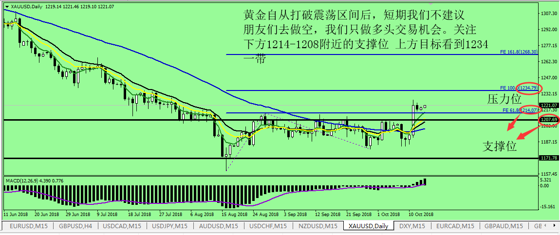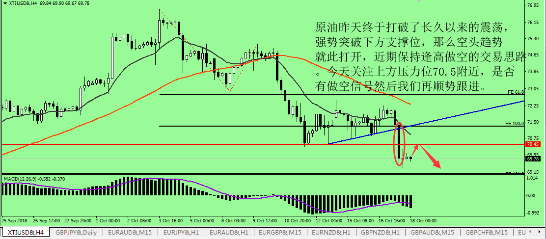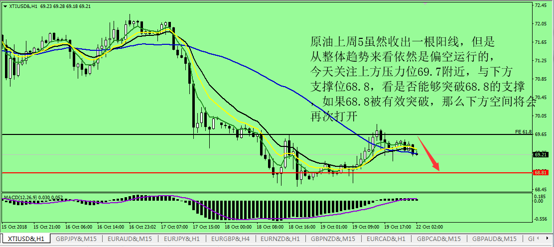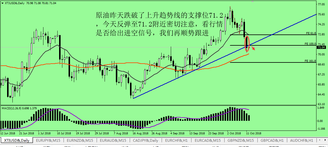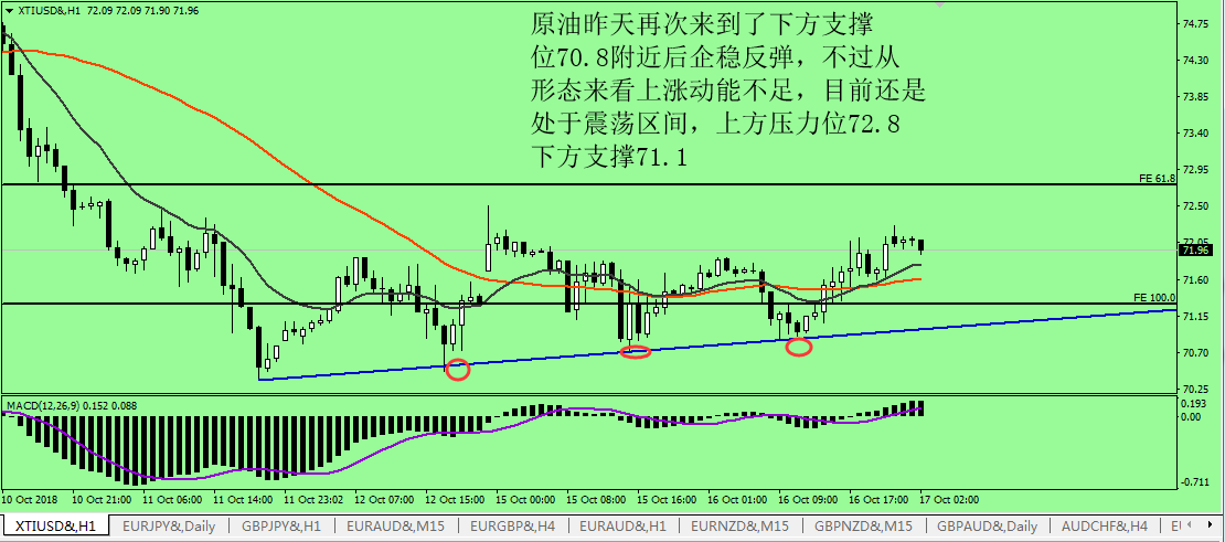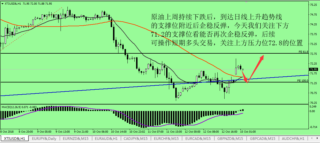 上周原油市场在经过各种月报的 “ 轰炸 ” 之后,油价也随之巨震,上周原油周线收出 71.51 美元 / 桶,跌幅 3.74% ,创下逾三个月来的最大单周跌幅。周一 (10 月 15 日 ) ,原油价格于欧市盘中稳步下跌,现报 71.57 美元 / 桶,将亚盘中的涨幅尽数回吐。 近期因美国飓风气候因素的影响,美国原油产地 — 墨西哥湾的原油产量已经锐减近 40% ,这对因 OPEC 国家增产而影响全球油价上涨起到再平衡作用,结合上周美国活跃油井数录得四周来的首次增长来看,飓风的破坏持久力长达近一个月,而眼下,美国原油产量才刚刚有复苏的迹象,所以我觉得短线内油价还能有一些上涨空间。 今日来