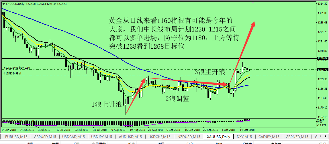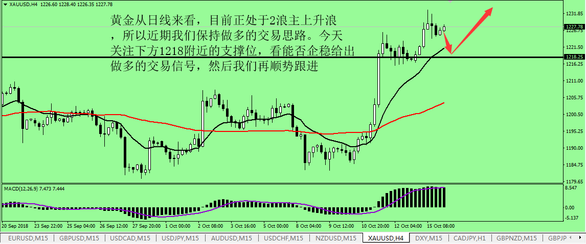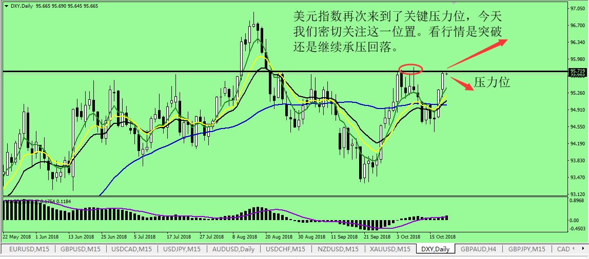 昨晚美指大涨,日内最高触及 95.66 ,创下自 10 月 10 日以来的最高水平,现货黄金则在震荡至 1229 美元附近后加速下坠,中收于 1222.29 美元 / 盎司,日内跌幅 0.22% 。周四 (10 月 18 日 ) 亚盘,美元指数延续昨日上升轨迹继续震荡走高,现报 95.67 ,而意外的是,现货黄金价格并未延续与黄金的负相关性,价格现报 1222.89 美元 / 盎司,日内涨幅 0.05% 。 老王看来,现货黄金价格于上周四的涨势打破了 60 日均线的压制,已经将黄金价格打入上升通道之中,而美元指数在本周二触抵 94.78 后的反弹趋势也在继续发酵,也能看出美元指数 95 关口