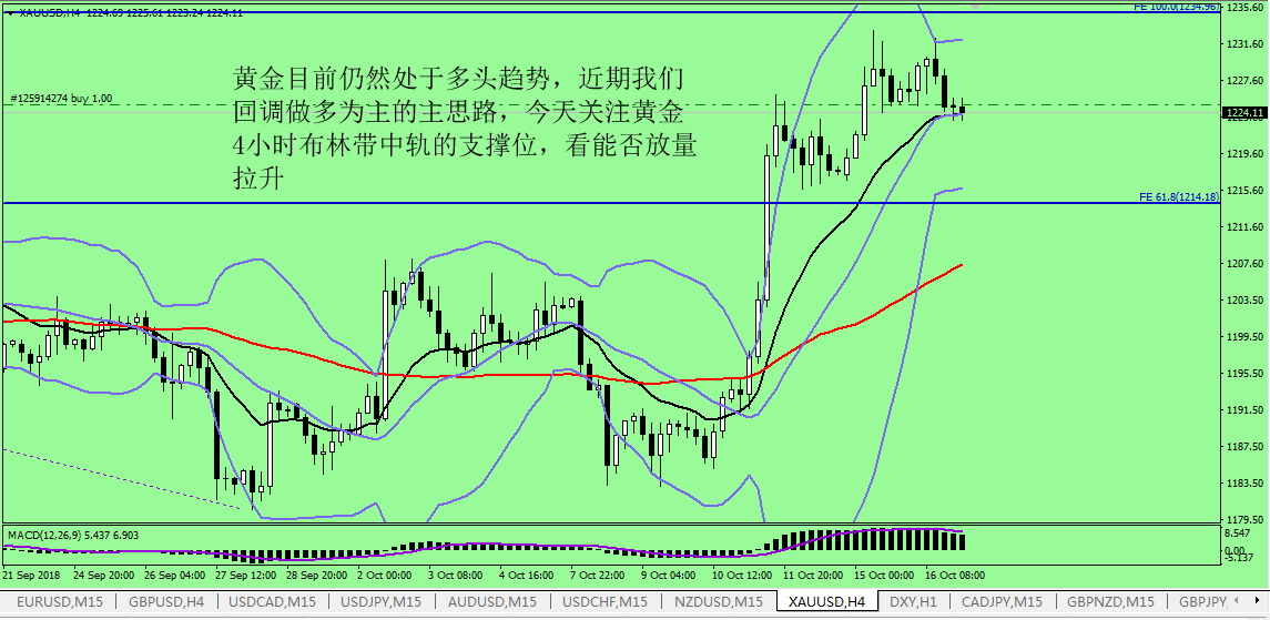 本周一 (10 月 22 日 ) 亚市,现货黄金与原油的行情都不算清淡,金价在早盘期间就升至 1229.67 美元 / 盎司,原油亦于午盘过后升至 69.69 美元 / 桶,由于今日缺乏更多经济数据上的指引,所以消息面和美元指数的走势将成为今天行情的主要参考点。 先看黄金,现货黄金价格自 10 日前开启反弹行情后,价格一路高升,最高触及 1233.33 美元 / 盎司,可以说是打破了前期的箱体震荡区间,但是从上周的走势来看,金价在涨至高点后并未形成有效的上行动能,反而重新建立了新的震荡区间,目前 1227 附近的价位也是黄金陷入震荡的例证。 从现货黄金 4 小时走势图上看,布林带三轨