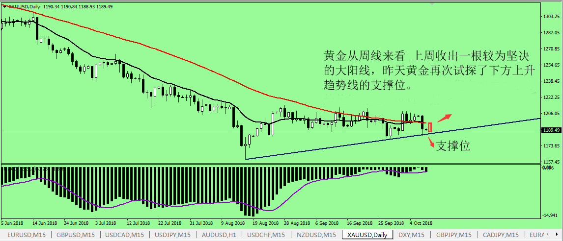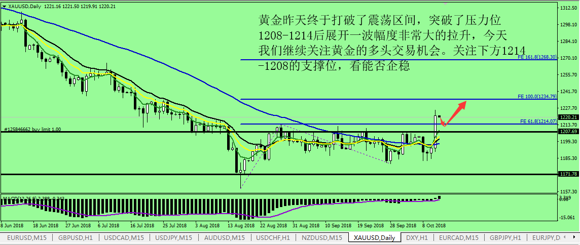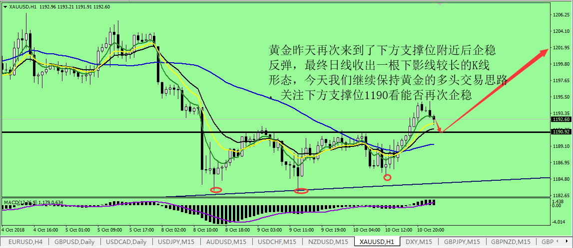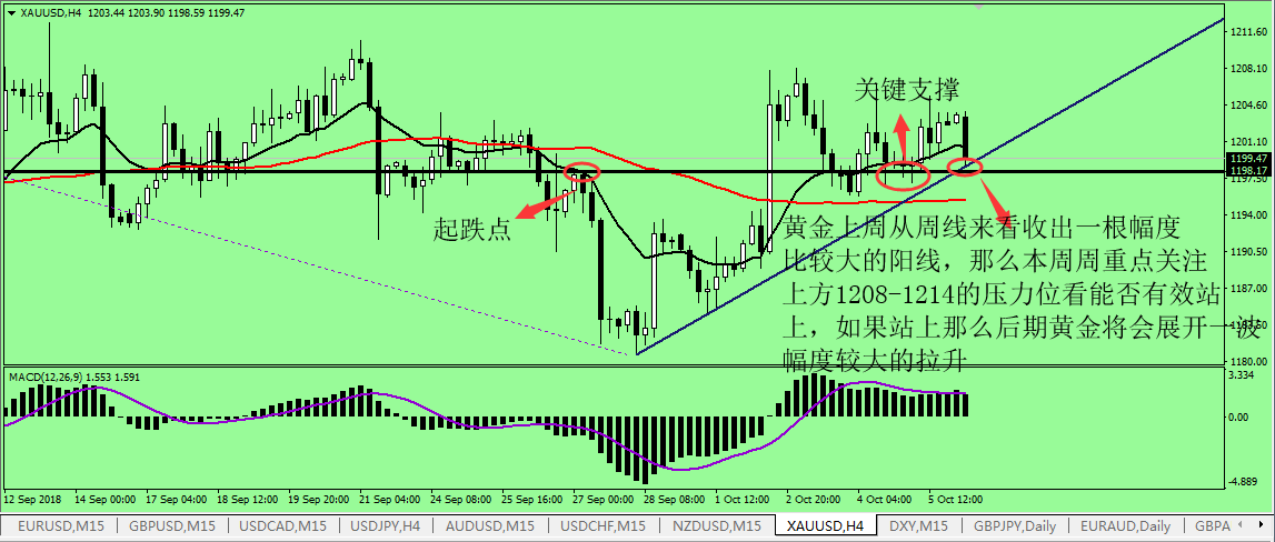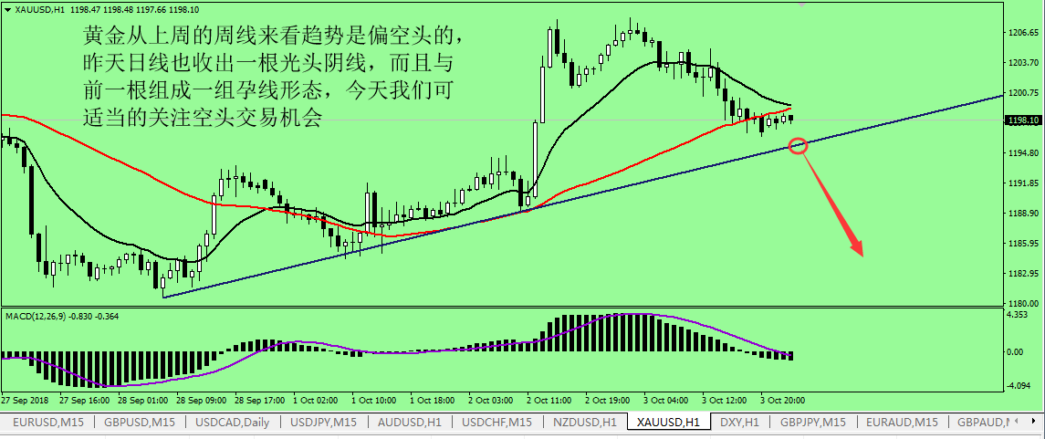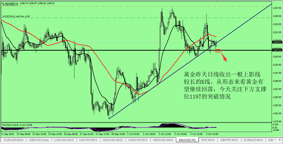 今日周五,黄金市场面临周线收官战,而值得关注的是,今晚美国劳动部将公布 9 月非农数据,通常在这种重大数据行情前,投资市场都不太会有过激举动,所以我认为今日黄金与近两个月时间里金价的震荡走势不会有什么不同,操作上可继续围绕下方的强力支撑位去搏短线。 现货黄金 1 小时走势图中,今日金价基本延续了连日来的震荡趋势,行情围绕 1208-1195 间来回扫荡,从 MA 均线指标来看, 10 、 20 日均线的走势稳中偏上, RSI 三线聚拢上升, MACD 快线于零轴下方上拐,绿色能量柱开始缩量,标志着当前金价将有一波反弹。 王德勤认为,昨天黄金于日线级别收于一个上影线较长的阳线,体现了黄金市