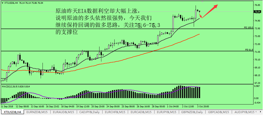隔夜 EIA( 美国能源信息署 ) 公布的数据表现利空,但油价仅在回落 60 点后大幅上涨,充分体现了当前市场多头原油的强势,今日 (10 月 4 日 ) ,原油价格于高位处回落,经过亚市的震荡后,于欧市早盘震荡上行,截止撰文,油价报 76.33 美元 / 桶,日内跌幅收窄至 0.07% 。 今日下午,沙特能源部长法利赫表示,如有需要,欧佩克准备好全面应用剩余产能。沙特有能力增产 130 万桶 / 日,欧佩克国家们也是如此。 王德勤分析,结合今日早间时段法利赫称本月沙特原油产量将增加到 1070 万桶 / 日,而 11 月还将继续提高,若法利赫所说的 130 万桶剩余产能属实,那么沙