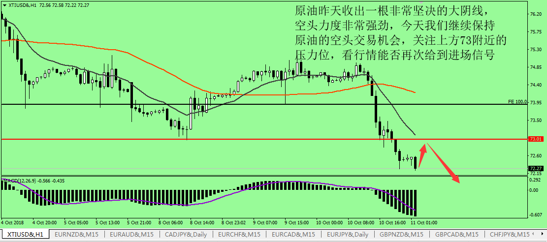 原油自上周冲高至近四年来最高的 76.90 美元 / 桶后,其震荡回落的趋势就开始成立,经过上周剩余两个交易日的震荡,眼下油价已经回到了上周一的 73.6 美元水平上,就目前技术面走势来说,油价在今日回吐上周涨幅的可能性较大。 原油 1 小时走势图上看,伴随着午后油价的震荡下跌,油价处于布林带下轨上方位置,而随着下轨的不断下移,原油下行空间也是不难预见, KDJ 、 RSI 指标双双死叉朝下,标志着短期内油价还会下跌。 王德勤认为,原油上周冲高回落,周线收出一根上影线较长的 K 线形态,从上方形成有效抛压,今天我们重点关注上方 74-74.5 压力位置,下方支撑位在 73.2 附近,如果
