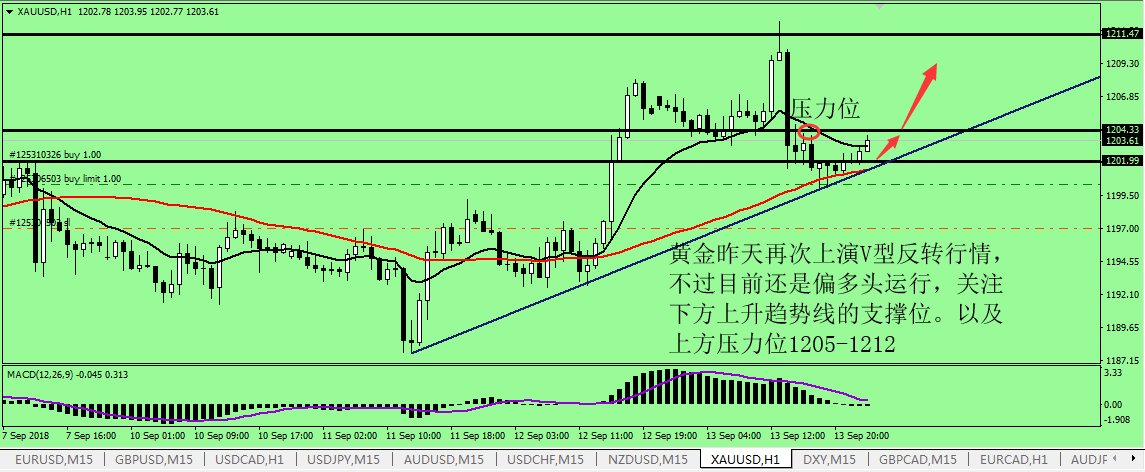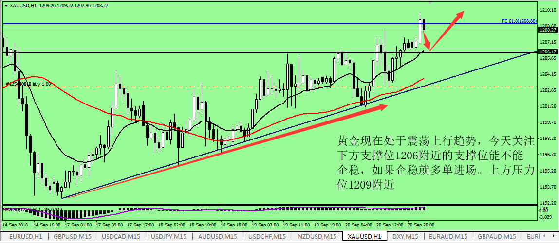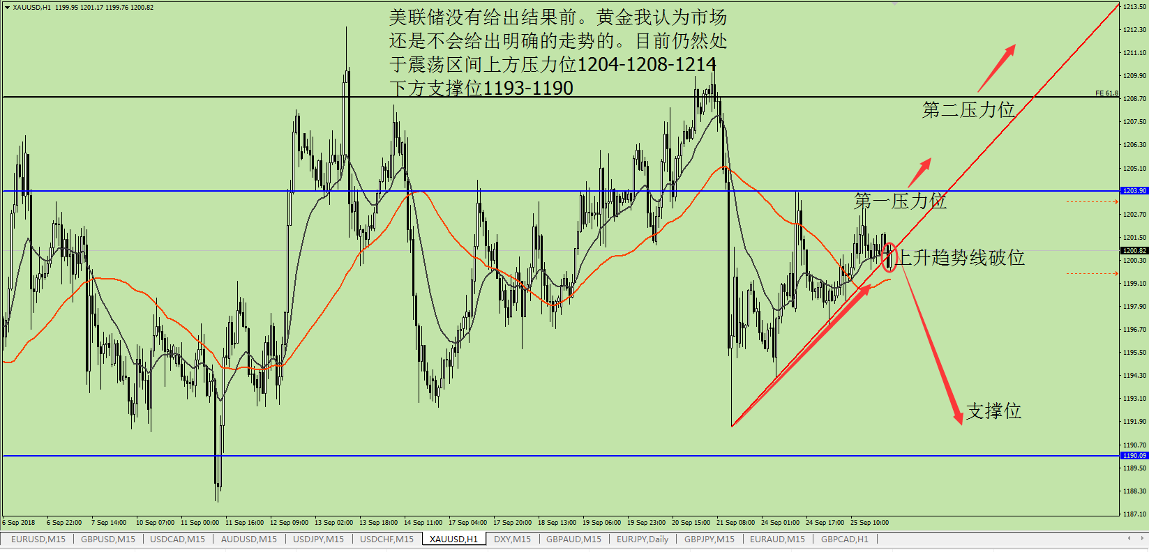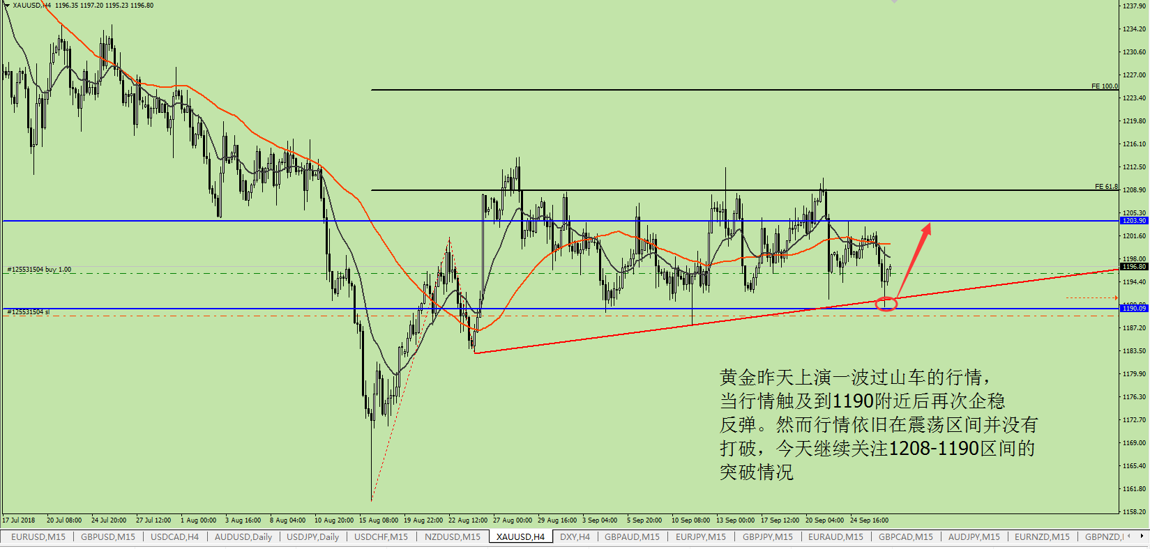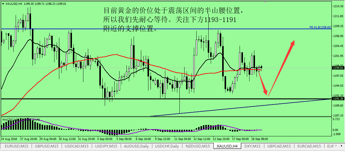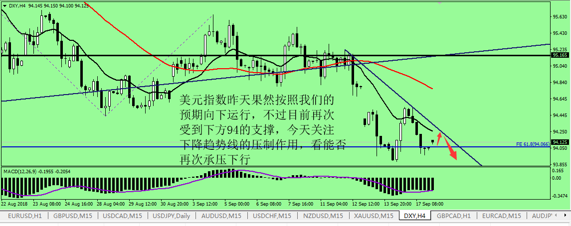 各位下午好,就美元指数而言近期美指一直按着我预想地那样下跌,在别人都看涨美指的情况下,我之前都是坚决看跌美元的,眼下美联储 9 月议息会议就将召开,这也许会打破美指目前的下跌趋势。 北京时间周三( 9 月 26 日)亚盘,美元指数在开盘升至 94.21 后继续涨势乏力,现报 94.17 ,单日涨幅收窄至 0.03% 。而乘美指涨幅收窄的影响,现货黄金价格得以重回千二关口上方,截止发稿,金价报 1202.25 美元 / 盎司,涨幅升至 0.08% 。 美元指数 4 小时图上看,当前布林带上下轨收口明显,但图中斐波那契 61.8% 位置和红色下降趋势线交点的 94 压力位依然有效, MACD