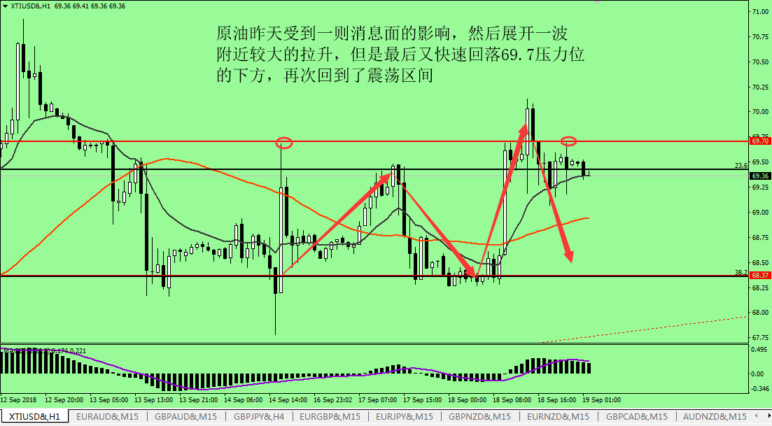原油昨日受消息面拉升后行情又快速回到 69.7 压力位下方,该位也是近期油价走出震荡和此后两波持续反弹的最高位置,可知原油昨天冲高至 70 美元 / 桶上方属于超涨现象。今日 (9 月 19 日 ) ,原油价格低开于 69.46 美元 / 桶,在触及 69.36 美元后震荡反弹,现报 69.74 美元 / 桶,日内涨幅 0.23% 。 北京时间周三凌晨,美国石油学会 (API) 公布了美国上周原油库存情况,具体数据显示, 9 月 14 日当周,美国原油库存上升 125 万桶,汽油库存减少 148.5 万桶,精炼油库存增加 153.6 万桶。 王德勤认为,上周美国 API 原油库存小幅