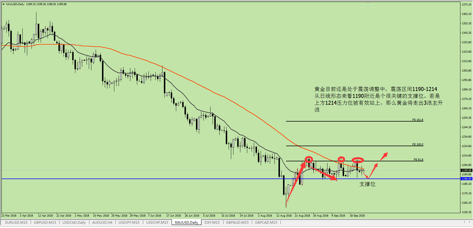 黄金方面,虽然说昨日 (9 月 24 日 ) 为周初常见的清淡行情,但由于本周美联储将公布 9 月利率决议,所以我预计在周四前黄金的清淡行情都将保持。此外,考虑到在两个月前就已经出现了美联储大概率加息的声音,故老王 以 为,美联储的加息预期已经渐渐被市场所消化,短期内很难对金价产生太多利空。 在现货黄金日线走势图中看,当前黄金价格震荡于布林带中轨一线, MACD 受阻于零轴下方,在双线升势趋缓的情况下可以看出,黄金短期上升动能不足, KDJ 指标死叉向下,表明黄价格还将震荡走低。 王德勤认为,黄金目前还是处于震荡调整状态中,日线级别的 1190 的支撑位非常关键,若行情下破则将打乱金价这