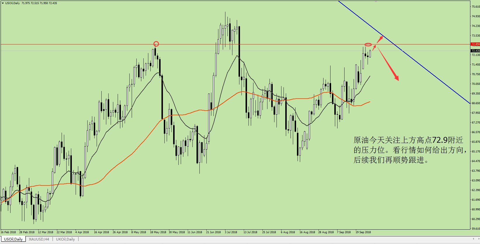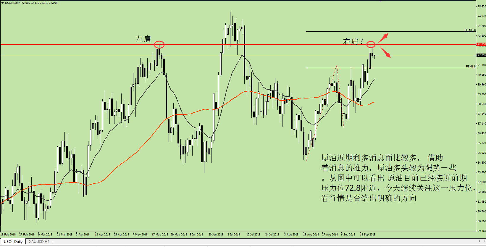 近期原油的行情主要由随着消息面的变化而变化,在美国对伊朗原油制裁日的临近,以及上周伊朗驻欧佩克代表称沙特和俄罗斯缺乏足够的原油过剩产能,两项因素助推国际油价两度冲击 72.80 美元关口。今日 (9 月 26 日 ) ,原油价格亚市高开于 72.09 美元 / 桶,整个亚市维持震荡局面,现报 72.23 美元 / 桶,日内涨幅 0.21% 。 王德勤 认为,因受美国对伊朗原油出口制裁日期日益临近、欧佩克拒绝增产等因素影响,近期国际油价持续攀升。这种受地缘风险因素影响国际油价短期内仍可能继续冲高,但中长线来看国际油价并不具备大幅上涨基础,今日来看,今晚有 EIA 原油库存数据的公布,而早盘