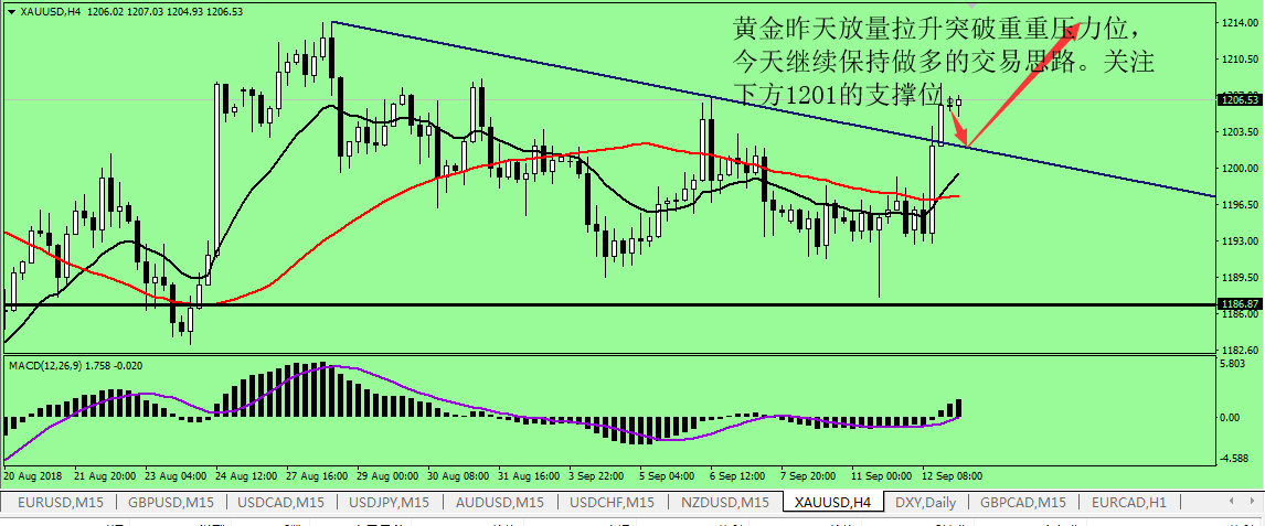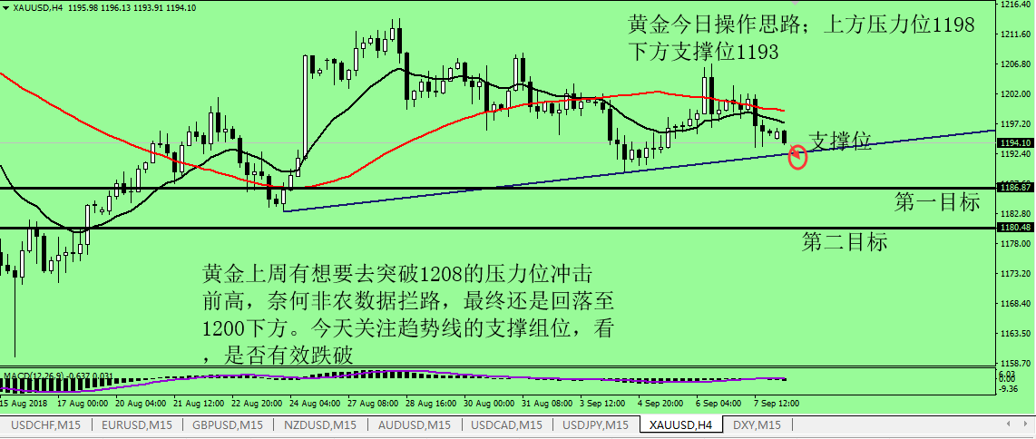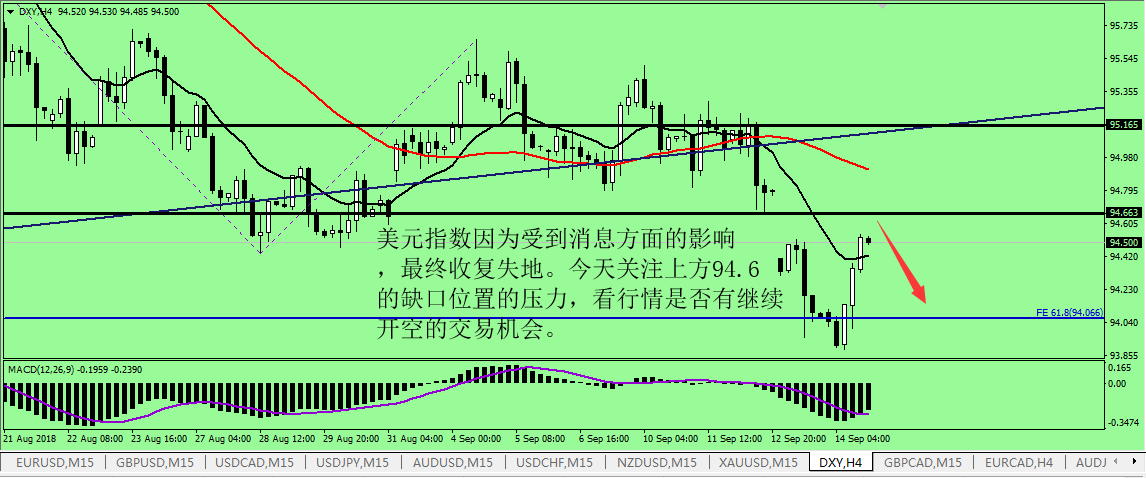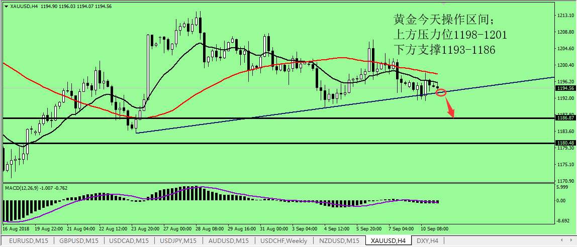 大家下午好,上周五美元指数再次上演 V 型反转,将行情从 94.35 的低位迅猛拉升至 94.90 附近,将现货黄金价格打压至 1191 美元附近。王德勤认为,上周五美国公布的几项经济数据表现抢眼,是美指重返高位的主要原因,而在指标中看,近期美指的 V 型反转已经出现过 4 次,不难发现美元指数的跌势很难维持。 在美元指数 4 小时图中,伴随着美指上周五的触底反弹,布林带下轨在走平后小幅收口, MACD 于零轴下方金叉走高且背离结束,表明美元指数当前震荡上行的趋势还在继续。 今日 (9 月 17 日 ) ,美元指数的震荡也为黄金走势带来指引,当前欧市盘初,黄金价格虽然于开盘价的 1194