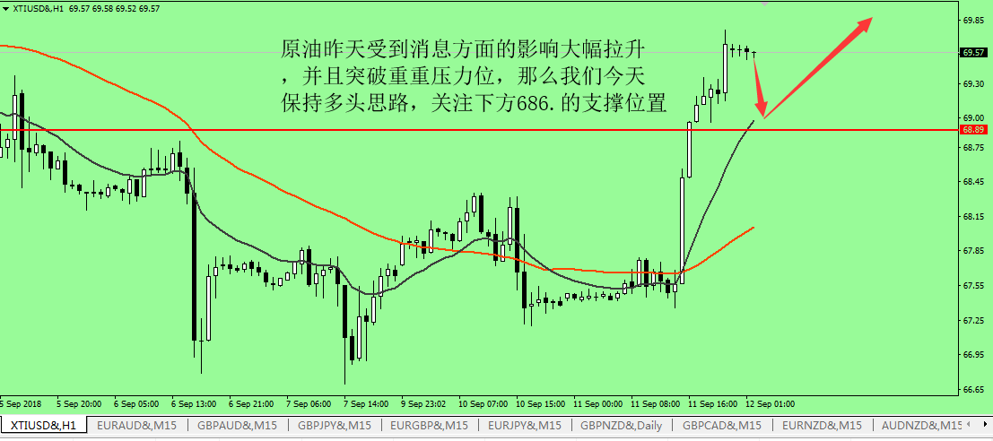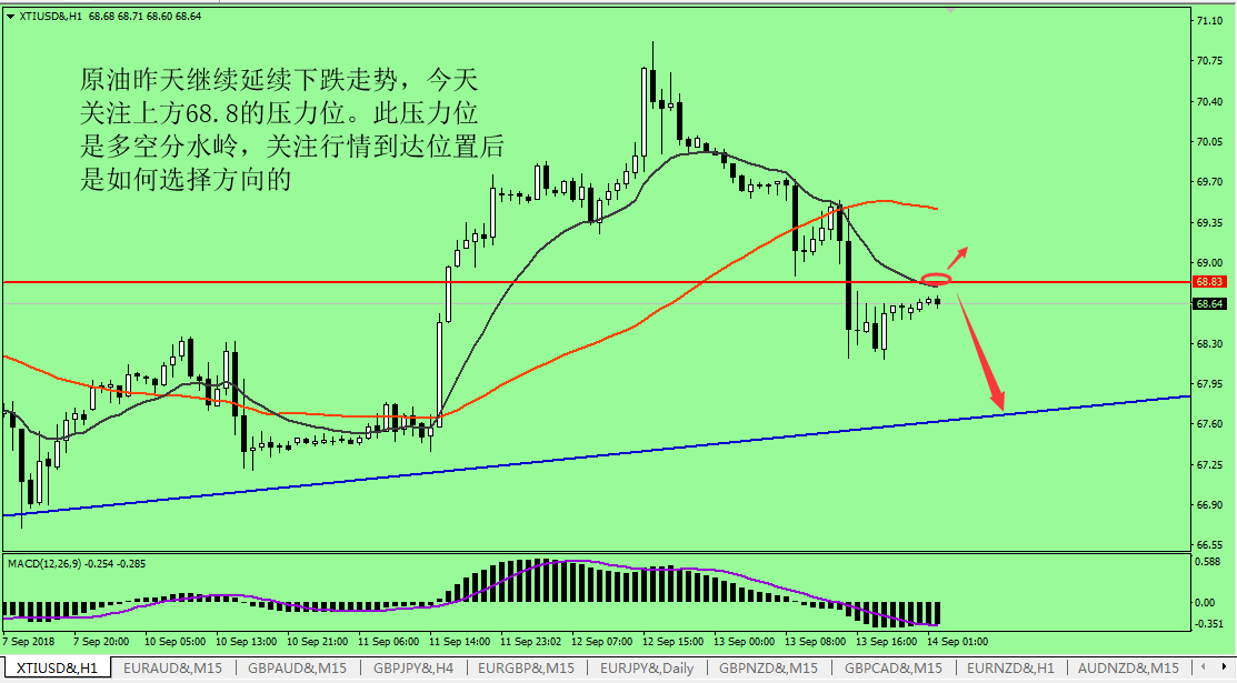 昨日原油行情可谓走出两轮单边,先是亚欧盘的单边上涨,再至欧市尾盘及美市盘中的持续跳水又把单边下跌行情予以呈现,就我的情况来看,原油昨天 40 点的盈利空间有些一般,今日 (9 月 11 日 ) 亚市早盘,原油行情清淡,我们等行情走出明显信号后再做空单操作就好。 原油 4 小时图上看, VOL 买入成交量极低, MACD 双线交织于零轴下方,红色能量柱微幅放量,一个相当于牛皮市的技术面也显示出当前原油市场极为清淡的现状。布林带三轨震荡走低,意指原油整体将呈缓慢下移的姿态。 王德勤认为,原油昨天的上涨并没有能够持续到晚间,行情最终跌破 67.8 附近支撑位,今日该支撑转为压力,所以日内油价触