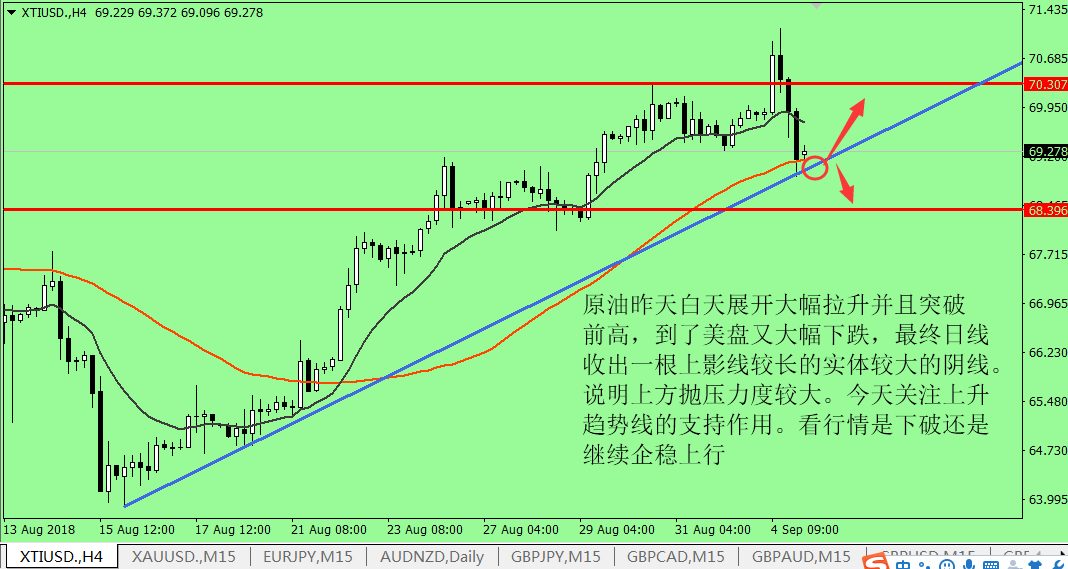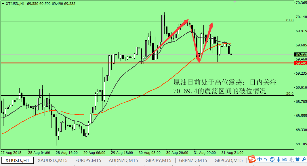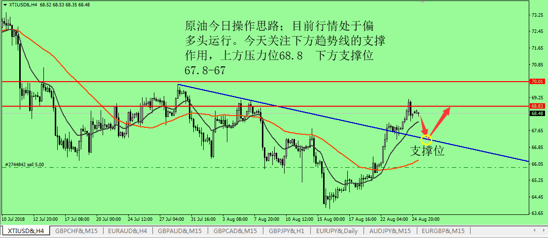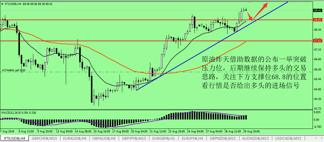 大家好,眼下欧盘时段,原油价格依旧延续了亚市期间高开高走的上升趋势,日内最高上探至 69.87 美元 / 桶,创下自 8 月 7 日以来的最高水平,老王看来,眼下无论从技术面还是基本面上看,原油都是一个多头看涨的走势,所以我们稳健点等价格回调一些后低多操作就行。 基本面上,昨晚公布的美国原油库存数据显示, 8 月 24 日当周 EIA 原油库存减少 256.6 万桶,远超市场预期的减少 96.7 万桶,精炼油库存录得下降 83.7 万桶,汽油库存下降 155.4 万桶,均与市场预期的增加 165.4 、 22.9 完全相左。由于 EIA 原油库存的全线下降,也将北美市场原油供应量不足的现