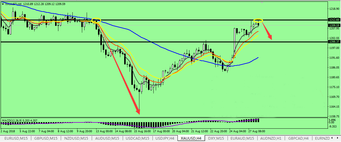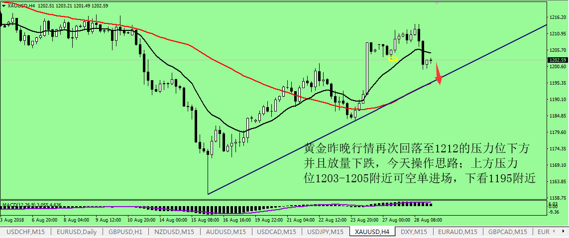昨天美指在触及 95.2 后继续下探,今日美指料续跌一波,下方重点关注 94.6 支撑位,基本面上看,由于新的北美自由贸易协议有望成型,北美市场的风险情绪减弱,在加元上行的同时,美元指数也在无声息中默默下跌。 从美元指数日线图上看,虽然美指仍处于上升轨道之中,但布林带愈加走平的走势足以增加市场空头美指的情绪, MACD 于零轴上方死叉向下,绿色能量柱持续放量且与 K 线无产生背离,表明美元指数当前的这波跌势仍将维持。 对于现货黄金而言,美元指数的走软对金价的反弹起到绝对利好,周二 (8 月 28 日 ) 亚盘,黄金价格略高于 1211.6 美元 / 盎司后小幅回调,进入欧盘,黄金价格再度
