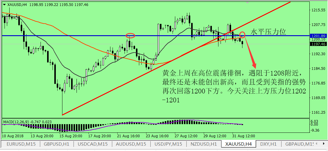 大家下午好,眼下进入欧盘,黄金、原油的振幅开始加大,黄金从亚盘的涨势中走出,较亚盘期间下跌了 3 美金,现震荡于 1204.6 美元 / 盎司附近,日内跌幅扩大到 0.07% 。 从现货 黄金周线图上看,上周金价的收阳略微缓解了黄金的下跌趋势,但 MACD 的死叉行情仍未见有反转的信号, RSI 三线分散缓慢上探,似乎表明当前金价的震荡上行走势还将维持。 王德勤认为,金价自上月跌破图中蓝色趋势线以来,行情就越发走弱,上周五金价大幅反弹,并且 K 线中也形成一组刺透的 K 线组合形态,目前金价受到 MA5 均线及图中黑色水平支撑线的压制,操作上建议高空为主,理想进场点位在 1208 ,下方