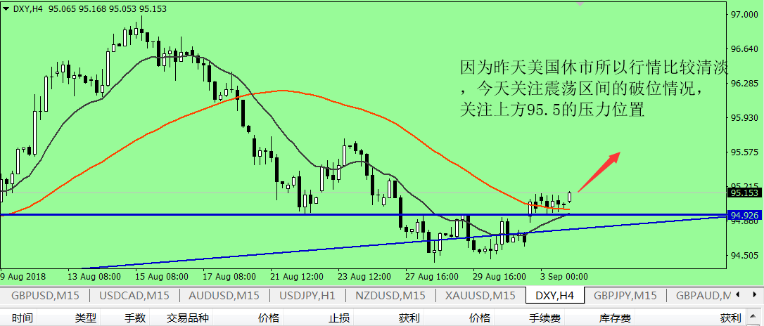 虽然美国总统特朗普曾多次表示 “ 不乐见美联储加息 ” ,但从近期的初请数据来看,美国就业市场着实非常强劲,这也是特朗普减税政策实施后带来的巨大改变,自此美联储在本月进行加息的概率已经高达 98.4%(CME 美联储观察数据 ) ,可以说已经是板上钉钉。 此外,原本设想美国与加拿大的贸易谈判可能在上周完成的计划也出现泡汤,明日 (9 月 5 日 ) ,美加两国还将就此问题进行第二轮谈判,但上周来自加拿大方面的不满或将为明日的谈判蒙上阴影,而在不确定性因素面前,投资者显然更倾向于购入美元以避险。这也是我认为美元指数还将继续上升的又一大理由。 美元指数 4 小时级别上看,布林带的小幅开口意指