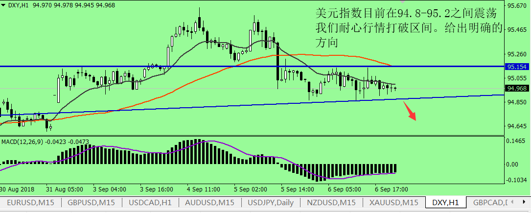 大家好,今日美元指数在开盘走高至 95.22 附近后震荡走低,日内最低触及 95.05 后开始反弹,我个人预计美指这波反弹将受阻于 95.20 一线,所以眼下不建议做多非美 ( 包括黄金 ) 。此外,今日为美国劳动节,北美市场休市一日,因此投资市场的波幅料不会太大,所以今天我们稳健操作的话,胜率还是很可期的。 而黄金方面,上周金价在高位震荡徘徊,遇阻于 1208 附近,最终也未能创下新高,并在上周五美指强势上涨之际回落到千二关口下方,可见黄金行情之羸弱。 在美元指数 1 小时图上看,今日亚市午盘,美元指数在最低触及的 95.05 后加速反弹,但 MACD 指标死叉行情与绿色能量柱的持续放