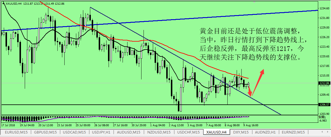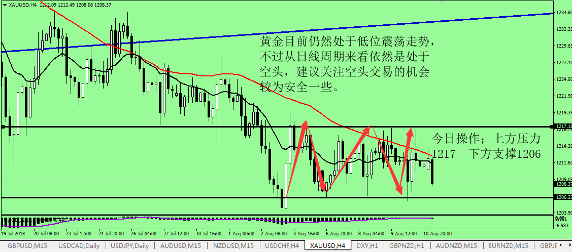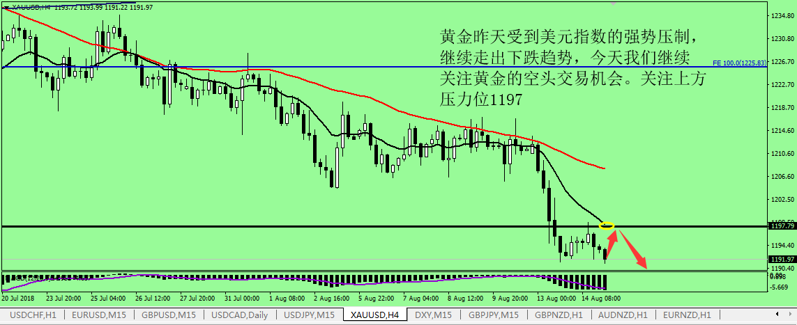 上周五美国总统的一则推特再度将投资市场搅得天翻地覆,特朗普称将对来自土耳其生产的钢铁和铝分别征收 50% 、 20% 的额外关税,这也是自今年 7 月 26 日特朗普在推特上称要对土耳其实施 “ 大规模制裁 ” 后,有一起针对土耳其的经济举动。从本质上说,在经济全球化的时代,美国这种关税行为无疑就是挑起了对土耳其的战争。 在特朗普的推文过后,土耳其里拉兑美元汇率短线暴跌 20% ,导致欧洲、亚洲多家银行及机构措手不及,由此引发较大范围内的金融危机,受此利好,上周五美元与黄金同时上涨。本周一( 8 月 13 日),美元指数开盘跳高后持续走高,目前来看,美元指数继续上破的问题不大,看来黄金价