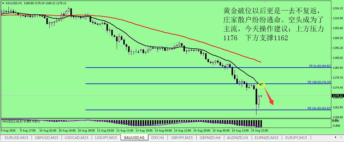 昨日美元指数在 “ 恐怖数据 ” 的带动下疯狂上攻 97 大关,虽然最终上攻失败,但录得 96.99 的高位也创下了近自 2017 年 6 月份以来的新高。今日 (8 月 16 日 ) 美指在亚盘盘初小幅震荡上行后迅速走跌,这也给了现货黄金价格反弹的动能,截至发稿,金价报 1176.60 美元 / 盎司,日内涨幅 0.15% 。 今晚美国劳工部将公布 8 月 11 日当周初请失业金人数及 7 月新屋营建、开工的数据,若在今晚的美国数据同昨晚的 “ 恐怖数据 ” 一样靓丽,那么非美、贵金属市场还将遭遇一波腥风血雨,而在此数据公布前,我们的非美布局都将以高抛低吸为主。 美元指数 1 小时图中