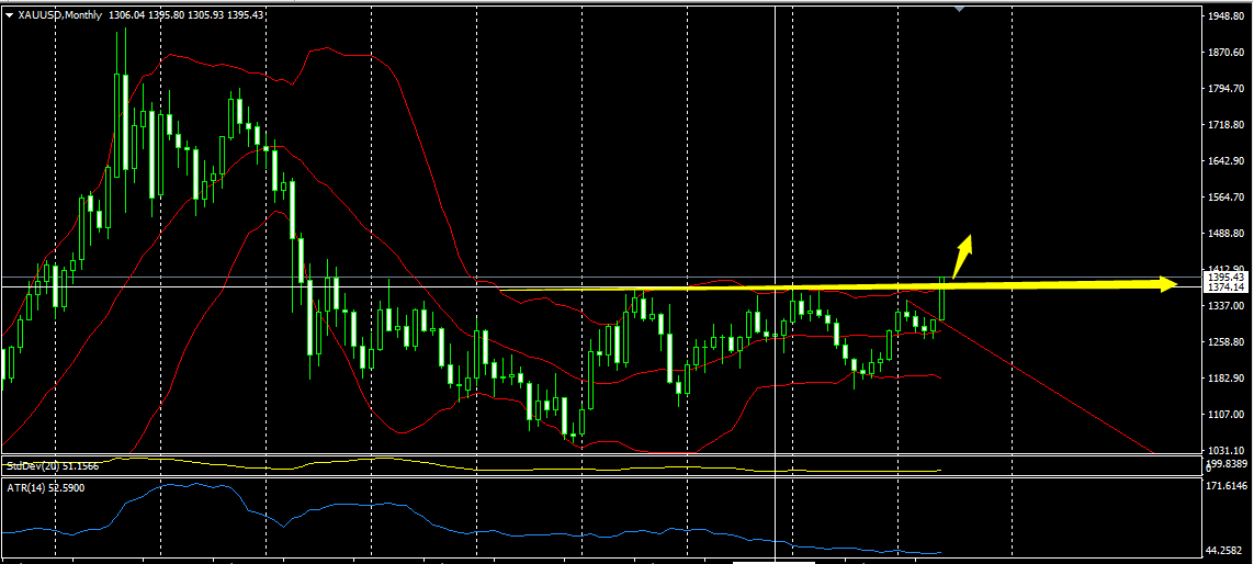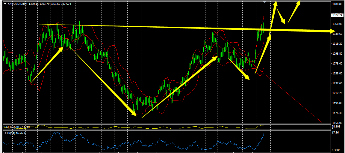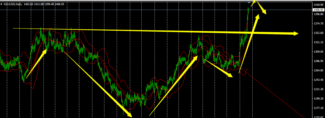 本月大的行情初始于非农,爆发在美联储决议,也是因为市场不排除美联储将在某一个时间段降息。黄金、对美货币等品种大幅上涨。目前黄金已经突破连续 5年高点,2011年到2019年时间周期,美联储或者即将进入降息周期。黄金已经具备牛市条件。 对美元而言,美元指数的上涨周期很有可能 即将结束,目前的下跌趋势有望继续蔓延。黄金渐渐接近前期 1435高点,本周围绕1400-1438区间盘整的概率很大。外汇方面也是大同小异,总之对美货币做多为主。 黄金从日线级别上看,行情自图中头肩底颈线位置强势反弹,在突破 1400后也没见明显修正,布林线保持开口向上,也能看出价格还有上行空间。 王德勤今日建议,黄金