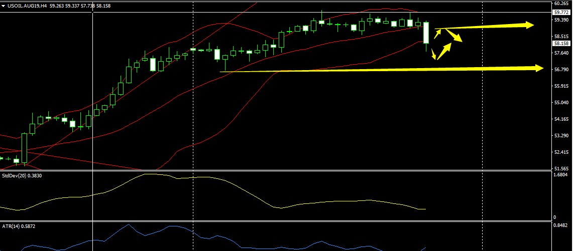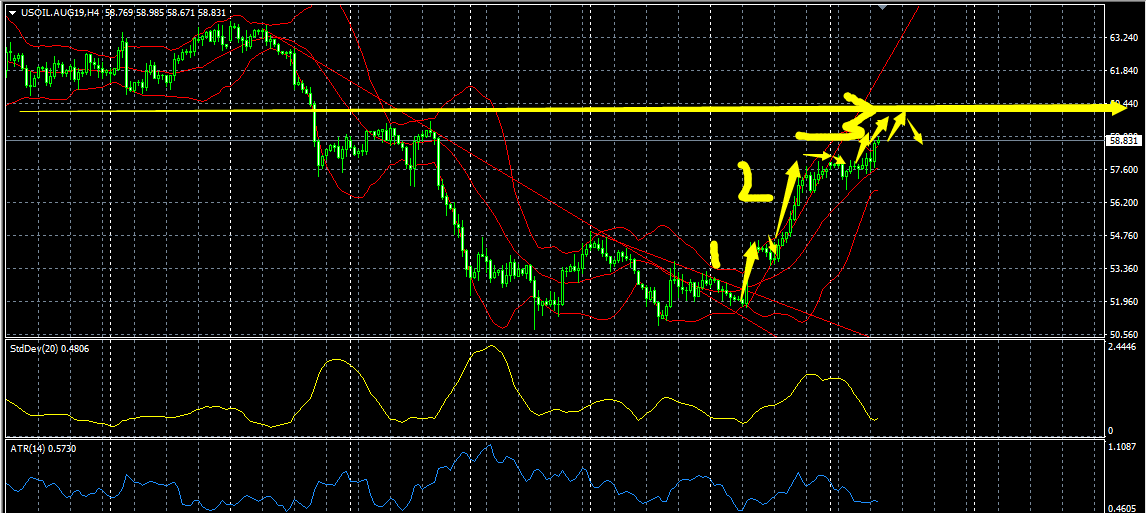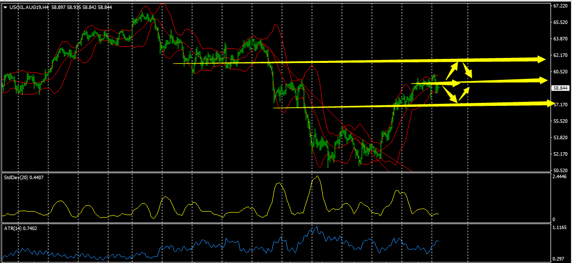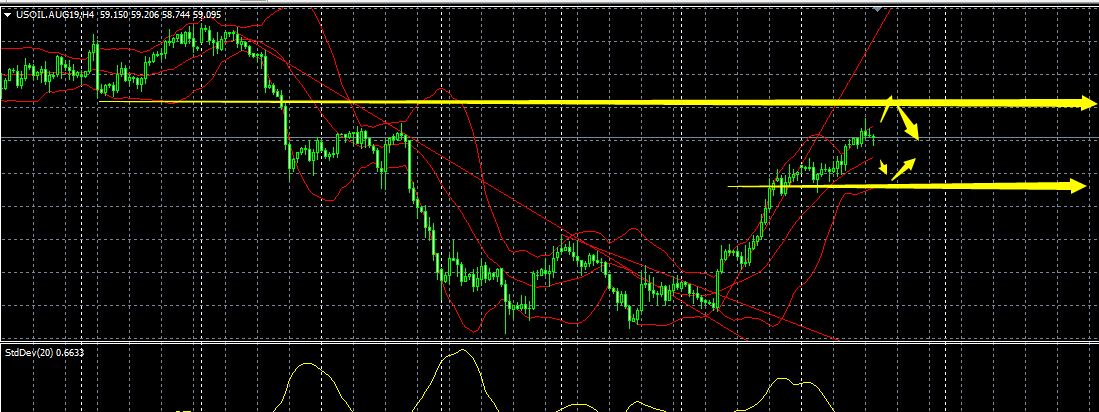 黄金我在昨天对本周行情进行了预测,就目前金价走势而言,基本上还是围绕 1438至1400区间震荡盘整为主。大级别上还是走我前期分析的圆弧底右侧整理。 30分钟走势图来看,行情在顺延趋势走高后,涨势已经出现弱化,布林线有所收口,20日标准差指标走平中有转低迹象,预计黄金将又一波回调。 操作上王德勤建议:黄金 1415附近做多,止损30个点,止盈60个点。1432附近做空,止损30个点,止盈50个点,点差自带。高位注意仓位控制。 原油我是预计本周将在 56.80到60.00做区间波动,从上图的4小时线中,前期始跌位的59关口将是近期油价反弹中面临的最大关口,目前布林线的上升趋势明显减缓,
