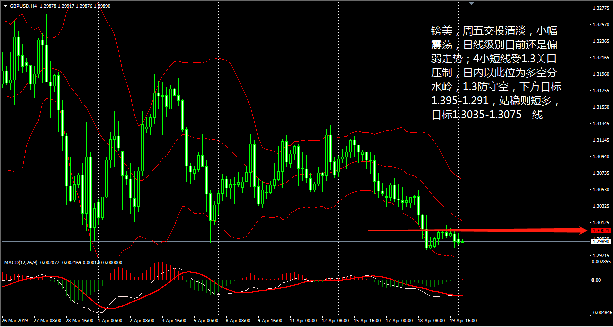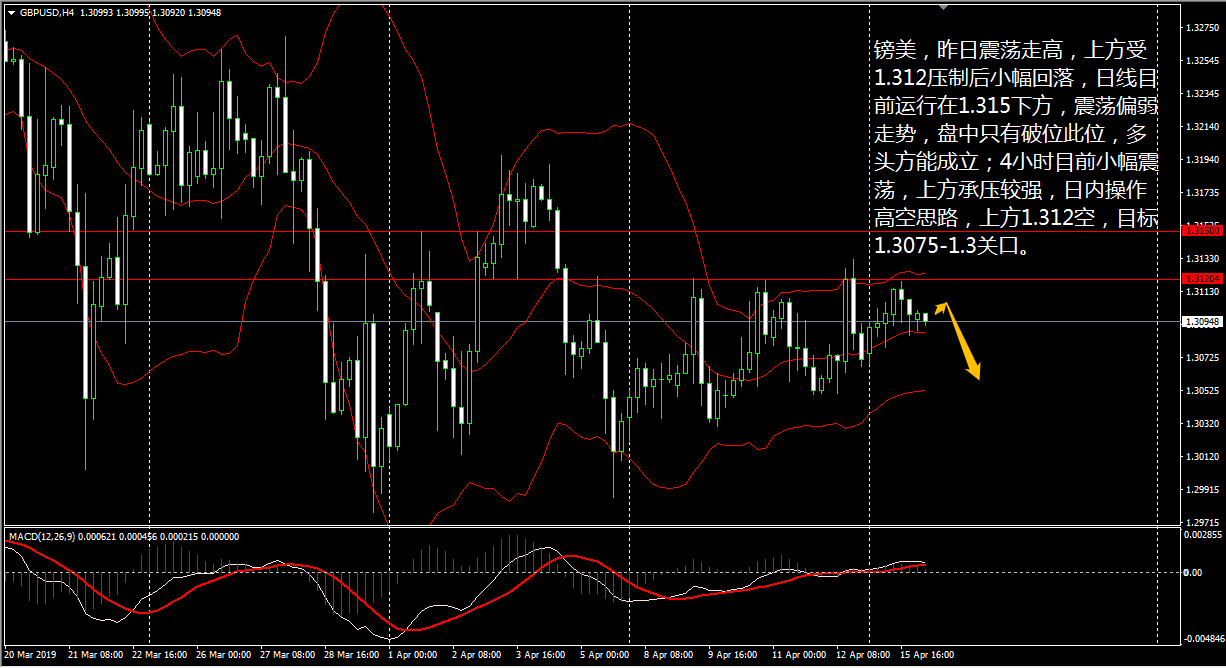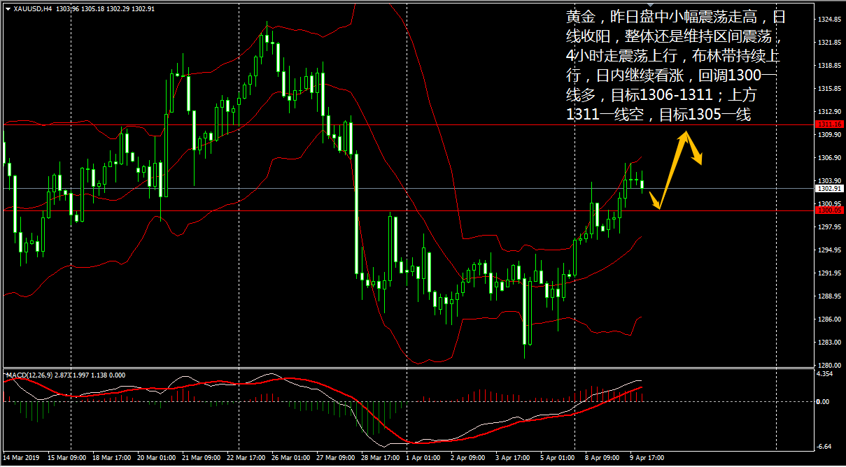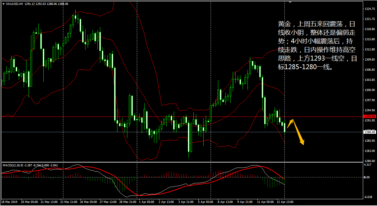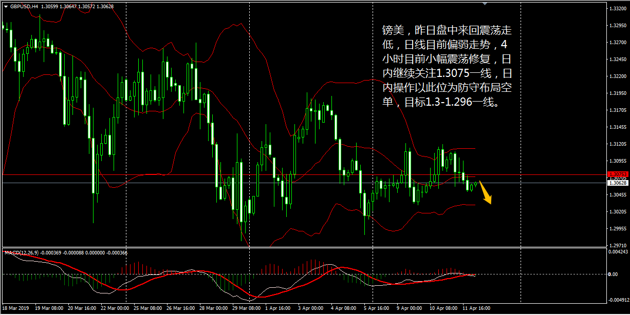 镑美昨日盘中来回震荡走低,收线在前日开盘价的 1.3058 ,整体行情趋于弱势,今日 (4 月 12 日 ) ,镑美在亚市午盘后再度将跌势展现,目前行情报 1.3062 ,早盘涨幅几乎完全回吐。 日线目前偏弱走势, MA 各级别均线走势分化, MACD 死叉延续至零轴以下,绿色能量柱小幅收量。 4 小时图上看,布林带窄幅收口后走势趋平, MACD 双线交织于零轴下方,体现了镑美当前低迷的行情,预计镑美还有震荡修复的空间。 王德勤建议,镑美日内继续关注 1.3075 一线,就以此位为防守布局空单操作,目标 1.3-1.296 一线。 黄金昨日大幅下挫,一举跌破 1300 关口,最低触抵 1