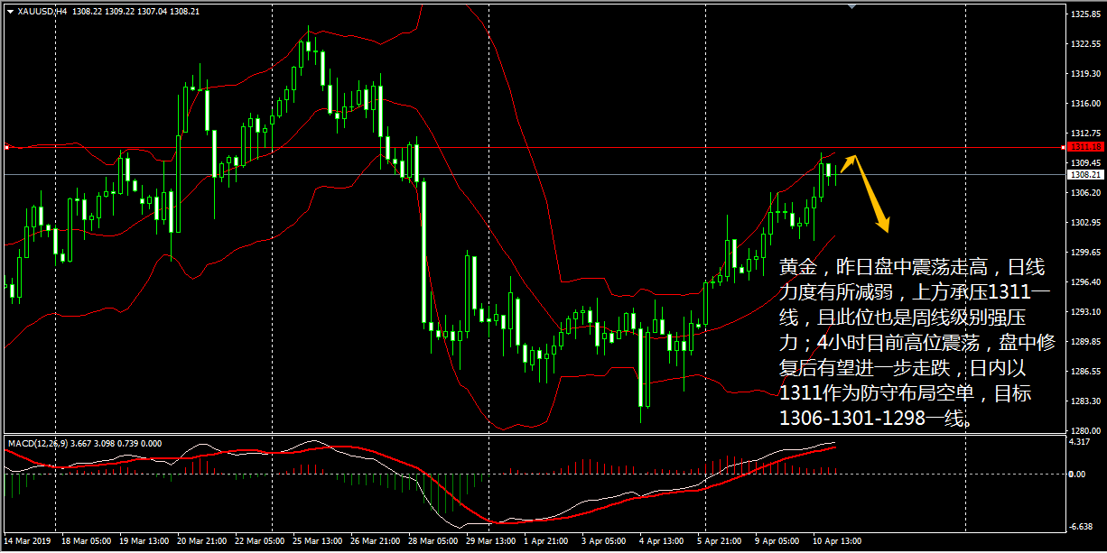 黄金昨日盘中震荡走高,并一度突破 1310.6 美元,此后行情小幅回调,收于 1308 一线。今日 (4 月 11 日 ) 亚盘,黄金价格短线跳高至 1309 美元一线,目前价格回落近 3 美元至 1306.4 美元 / 盎司,跌幅 0.13% 。 日线级别上看,布林带有上升收口之意, CCI 升势减缓, RSI 三线拐头朝下, MACD 于零轴下方的金叉与行情背离,预示着金价短期内仍有望继续回落。 4 小时线上看,黄金自昨晚冲高后行情回落修正,目金价上方承压于 1311 一线,同样该位置也是周线级别的强压力, RSI 交叉下行, MACD 红色能量柱持续缩量,且双线有下拐之意,走势偏弱