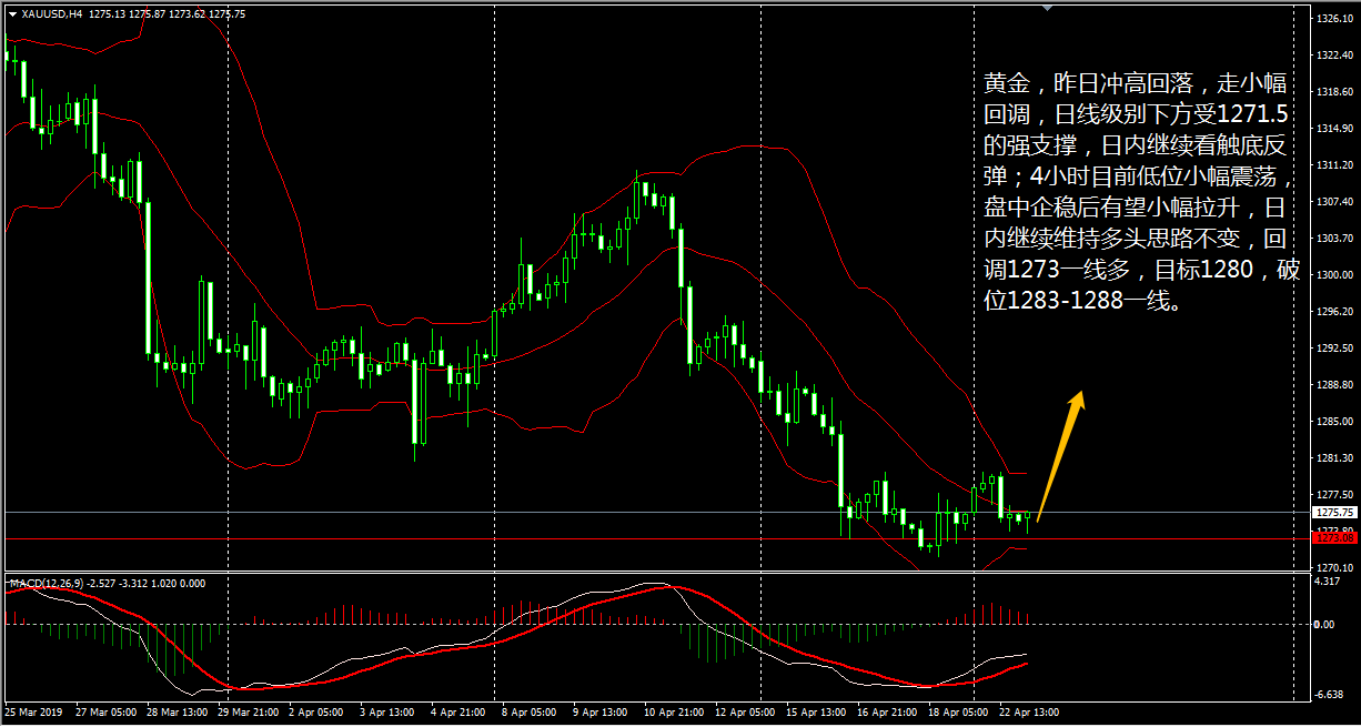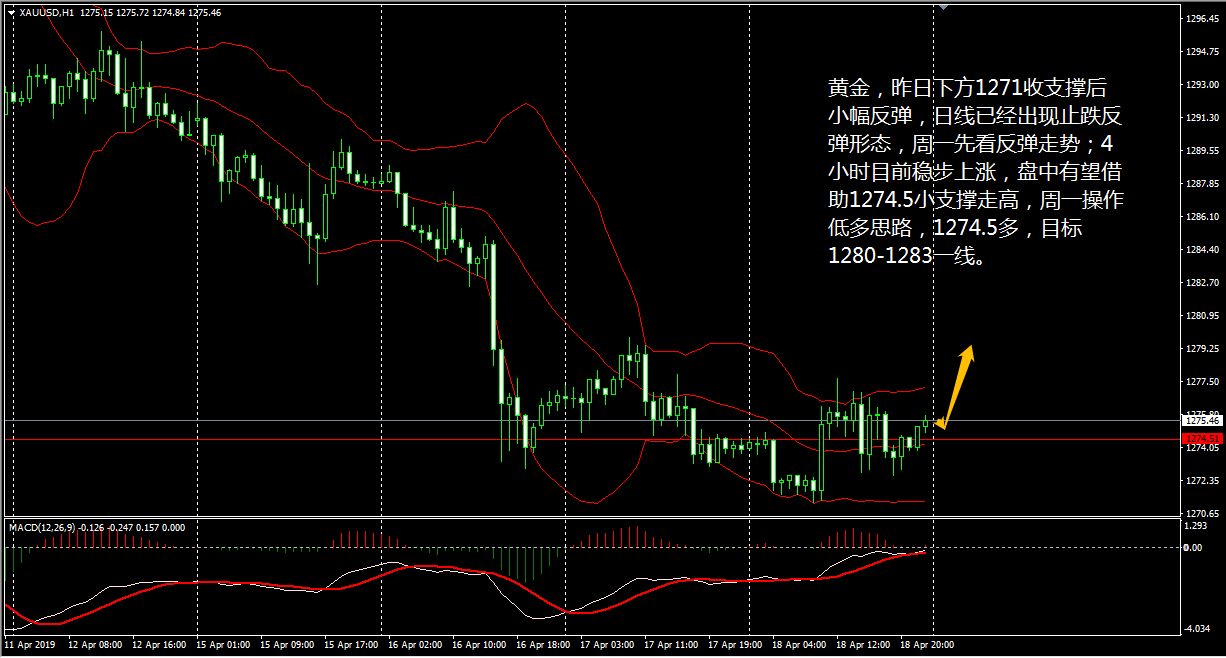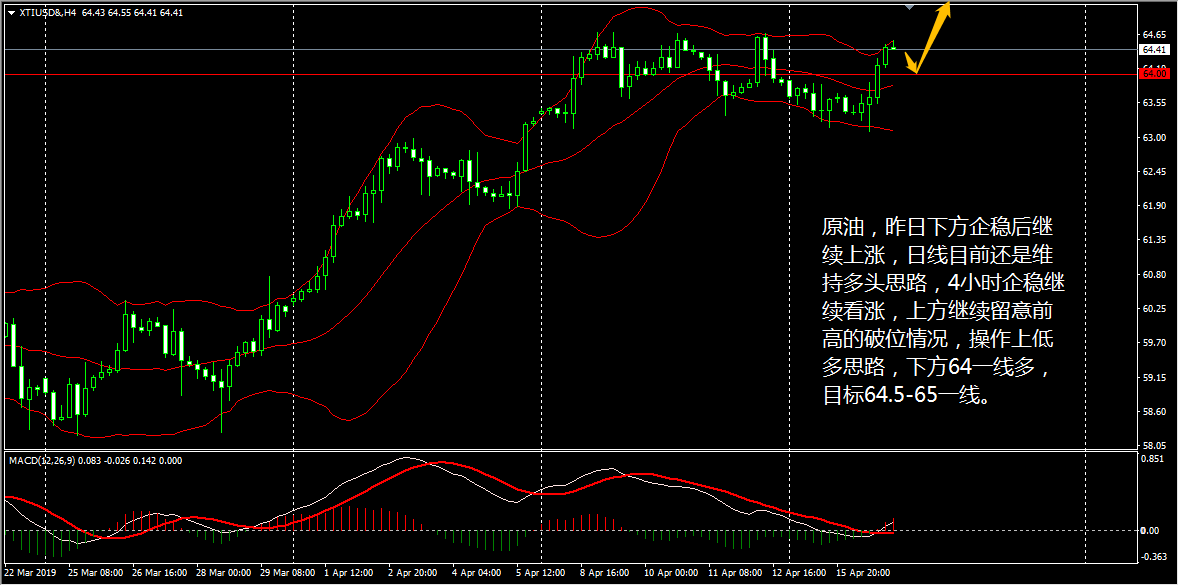 黄金昨日下方受 1271 支撑而小幅反弹,与我们昨天预测的点位分毫不差,今天 (4 月 19 日 ) 耶稣受难日全球主要交易所休市,下周一我们继续看黄金反弹走势,多单进场点位可以较昨天稍微上移一些。 日线级别上看,黄金已经出现止跌反弹的信号, KDJ 指标已然上拐, CCI 升至卖出线附近,表明还有拉升空间。 4 小时级别上, MACD 于超卖区形成金叉,红色能量柱保持放量, KDJ 走势上行,表明行情有稳步上涨的趋势。 王德勤建议,下周一黄金继续低多操作, 1274.5 做多,目标 1280-1283 一线。 原油昨日盘中企稳后小幅走高,日内收涨 0.49% 至 64.06 美元。从日