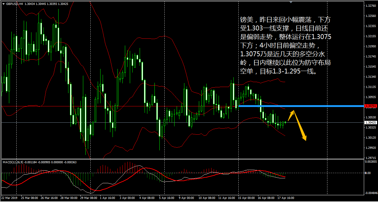 黄金昨日盘中大幅下挫,并一举跌破 1280 关口,今天 (4 月 17 日 ) 行情在日线上已经逼近 1275 的前期支撑,而目前的触底反弹也是量能有限, CCI 跌至卖出线下方, KD 线死叉向下,日内行情已经走弱。 4 小时线上看,布林带下拐出现窄幅收口,暗示黄金的下跌有所企稳, CCI 与 KDJ 指标同步上行, MACD 绿色能量柱持续收量,表明金价当前的反弹还未结束。 王德勤认为,黄金日内留意 1271.5 的强支撑,待指标修复后继续看空,操作上以 1280 一线布局空单,目标 1271.5-1266 一线。 镑美昨日盘中小幅震荡后,跌破 1.3075 一线,也是正如我在近期所