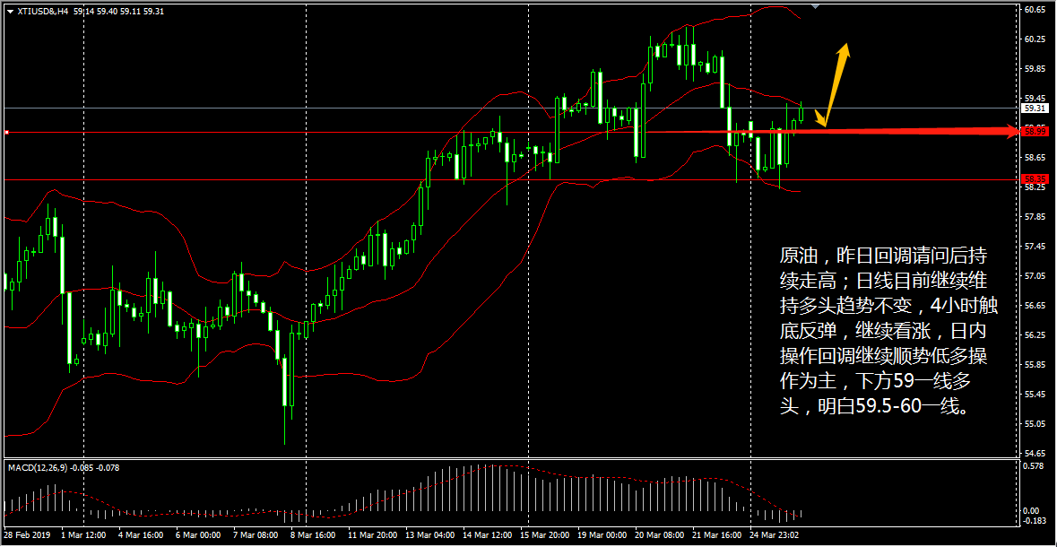 黄金昨日走出慢涨行情,日线级别中收出中阳线,目前布林带三轨持平, MACD 双线升至零轴上方, CCI 指标于买入线上方下拐,意指行情将有回落。 4 小时线上,各级别均线呈多头排列, MACD 快线自上而下接触慢线,红色能量柱持续缩量,暗指行情将持续走低, CCI 指标跌至中性区间,表明黄金多头优势有所减轻。 操作上老王认为,黄金目前多头走势完好,日内继续以低多为主,下方 1314.5-1317.5 出现做多信号可以多单入场,目标 1325-1330 一线。 再看原油,原油昨日在亚盘初期跌至 58.35 附近后继续走高,在美市盘中几经震荡,终究还是站上了 58.8 美元上方。今天 (3 月