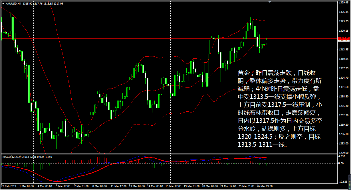 黄金昨日震荡走跌,日线上收阴,但弱于前日阳线,各级别 MA 均线呈多头排列, MACD 升至零轴上方,红色能量柱基本维持放量,该级别整体趋势偏多。 4 小时线上看,当前行情受 30 均线的 1313.5 支撑而小幅反弹,上方目前受 1317.5 一线压制, MACD 死叉继续下行, CCI 于卖出线上方小幅震荡,整体行情偏弱。再从小时线上看,布林带三轨收口,行情走震荡修复, CCI 升至买入线下方,看来黄金短期内的反弹动能将持续运行。 王德勤建议,黄金日内以 1317.5 作为日内交易的多空分水岭,站稳则做多,上方目标 1320-1324.5; 反之则空,目标 1313.5-1311 一