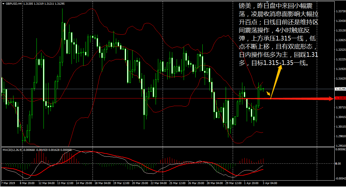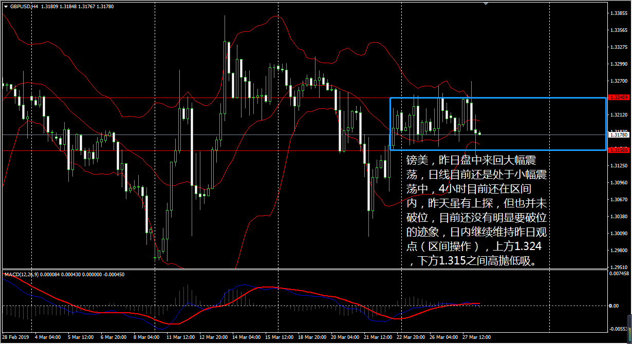 黄金昨日盘中来回大幅震荡,晚间瞬间跌破 1313.5 关口,整体收阴,日线级别目前持续走回调, MACD 仍处于多头区域, RSI 三线小幅上扬, CCI 跌至中性区间,表明黄金的下行力度有所减弱。 4 小时线上看,布林带三轨走平, CCI 于卖出线下方上行, RSI 小幅下拐, MACDDIFF 线跌至空头区域,动能柱保持小幅放量,说明金价的反弹动能也不强。 王德勤建议,日内继续留意 1311 一线,站稳则可看多,上方目标 1317-1320; 如若盘中回调 1306 一线有做多信号可多,目标 1311-1317 。 镑美昨日盘中来回大幅震荡,但终究还是回到了日线级别布林带中轨的 1.