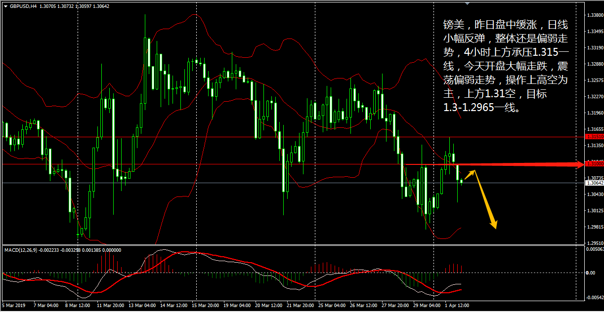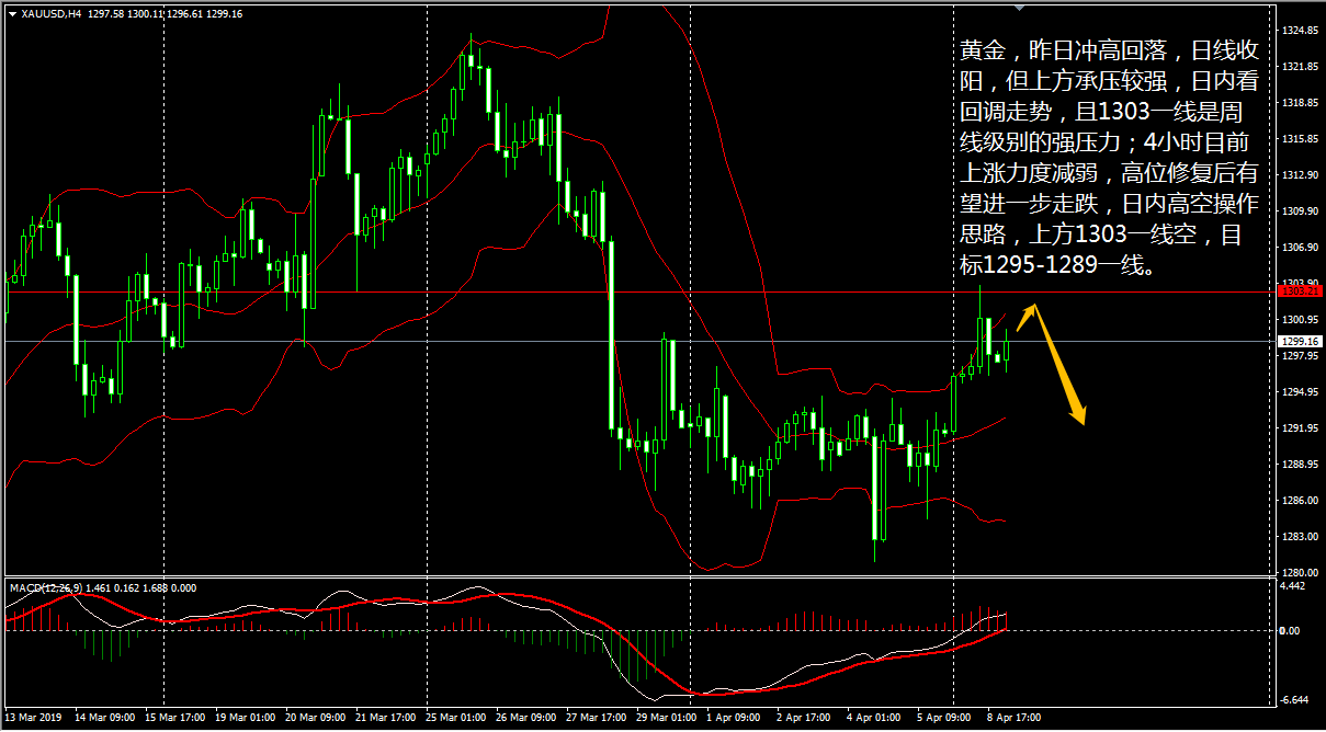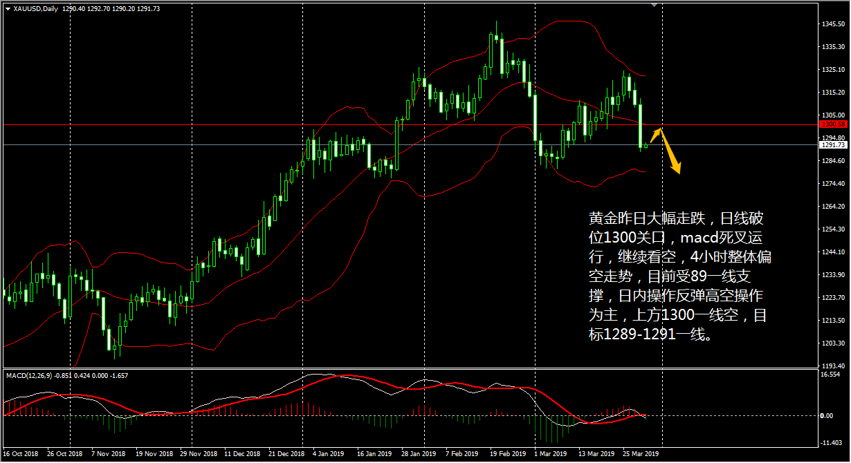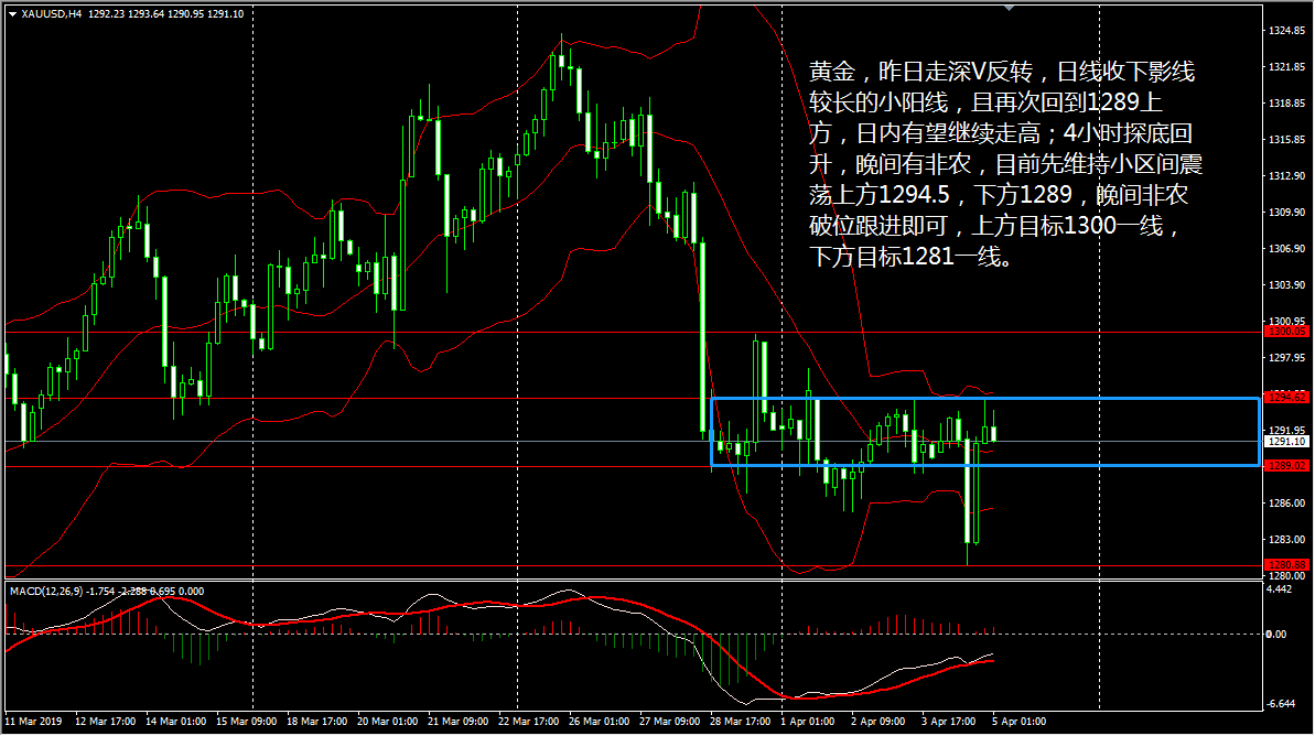 黄金在昨日美市开盘后走出深 V 反转,价格旋即升至 1294.5 的三日来新高,尾盘回落 3 美金至 1292.2 美元收盘。今日 (4 月 5 日 ) 将公布每月一次的非农就业报告,届时市场上又将掀起波澜,但从目前的走势来看,金价还是一个震荡偏下的行情 。 日线级别上看,昨日黄金收下影线较长的小阳线,且再次回到 1289 上方,日内有望继续走高, 4 小时线上,行情从超跌情况下探底回升,但目前上行动能趋弱, CCI 由中性区间跌至卖出区间上方, MACD 动能柱持续减少,快慢双线亦处于零轴下方,表明当前金价将有下滑。 王德勤认为,黄金目前维持小区间震荡,上方 1294.5 ,下方 12
