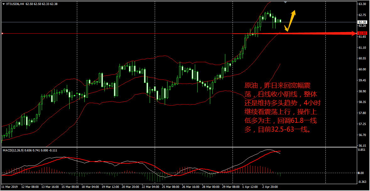 黄金昨日小幅震荡,日线收阳,且收线位于 1289 上方, RSI 三线分散上升,布林带窄幅收口,说明黄金下行空间已经受限,现在行情朝布林带中轨处缓慢上行,且与上方 1300 压力位还有近 7 美金的距离,因此可以短线看涨。 4 小时图上看,金价自触底反弹后涨势基本维持, KDJ 指标继续走高, MACD 红色能量柱持续放量,短线上确有企稳上涨迹象。王德勤认为,黄金日内看震荡上行,以 1289 为防守布局多单,目标 1295-1300 一线。 原油昨日震荡走高,并再度刷新了近半年来的新高,今天 (4 月 3 日 ) 亚盘,行情于 62.6 附近继续走高,眼下亚市下午盘,油价稳步跃升至 62
