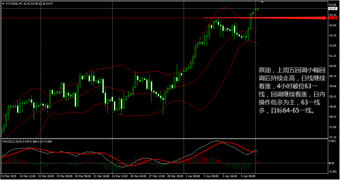 黄金昨日来回窄幅震荡,且 0.48% 的振幅也是刷新近一个月来最低,今日 (4 月 4 日 ) 到目前为止,黄金的振幅依旧不大,现报 1292.75 美元 / 盎司,涨幅 0.22% 。 日线级别来看, RSI 三线聚拢上行, MACD 死叉略微走缓, CCI 升至中性区域,为反弹信号。 4 小时线上布林带三轨走平, CCI 有升至买入区间的意思, MACD 上扬并接近零轴, KDJ 三线小幅上升,走势震荡偏上。 王德勤认为,黄金下方受 1289 一线支撑,日内继续维持昨日观点,即 1289 一线布局防守多单,目标 1295-1300 一线。 原油昨日宽幅震荡,在触及 62.99 美元后