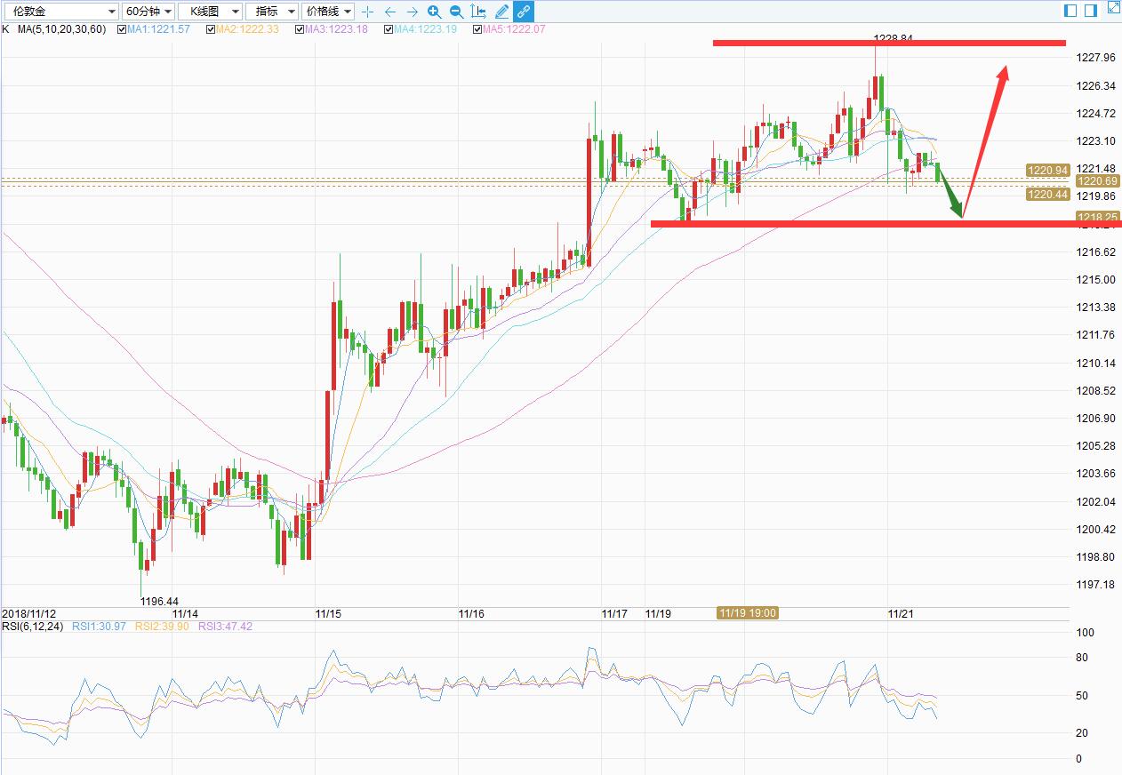 周三(11月28日)现货黄金小幅收涨,亚市早盘开于1214.6400美元/盎司后震荡上涨,后转盘整,金价徘徊不前。欧市金价延续盘整走势,多空博弈空方领先。美市金价波幅加大,录得日内低点1210.65美元/盎司后反弹,多头突然发力,金价跳涨,一柱擎天,录得日内高点1226.40美元/盎司后回落,多空再度交锋,最终收盘于1220.90美元/盎司。 昨日,受美联储主席鲍威尔讲话的影响,美元指数大幅跳水,现货黄金重返1220关口上方。随着周五的20国集团峰会临近,投资者需密切关注国际贸易紧张关系,尽管周一美国总统特朗普发出了较为强硬的声音,但其首席经济顾问在周二则发出了混合信号,称将于周末与中国达成